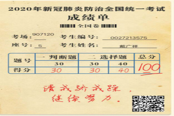 一张答卷:通过开展线上答卷形式,号召员工参与《2020新冠肺炎防治统一考试(全国卷)》考试,进一步提高员工对新冠肺炎防治知识的了解,增强员工的防范意识。