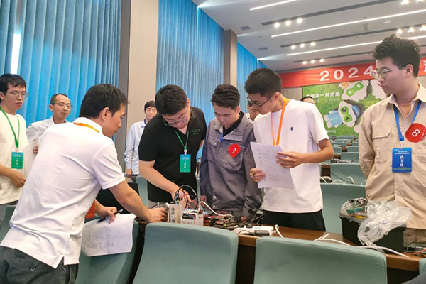 竞赛分理论知识竞赛和实操技能竞赛两个环节,旨在检验选手在控制系统的电路设计和编程、电气控制系统的安装接线和调试等方面的技能水平。竞赛现场气氛热烈,参赛选手们聚精会神,熟练地进行布线、接线、编程等操作,展现出精湛的业务能力和过硬的技术水平。
