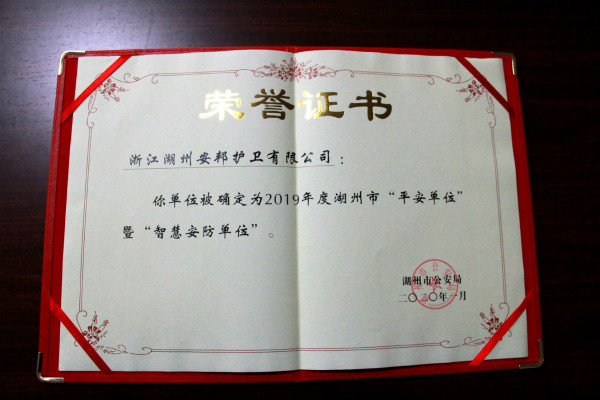 经过全体员工的共同努力,湖州公司被省保协评为“浙江省2019年度优秀保安服务公司”、被市财贸工会评为“2019年度优秀基层工会”、被市公安局评为“2019年度湖州市‘平安单位’暨‘智慧安防单位’”。