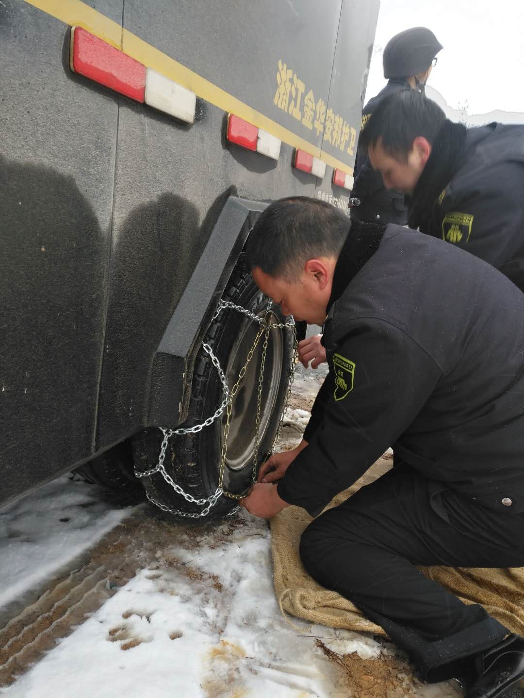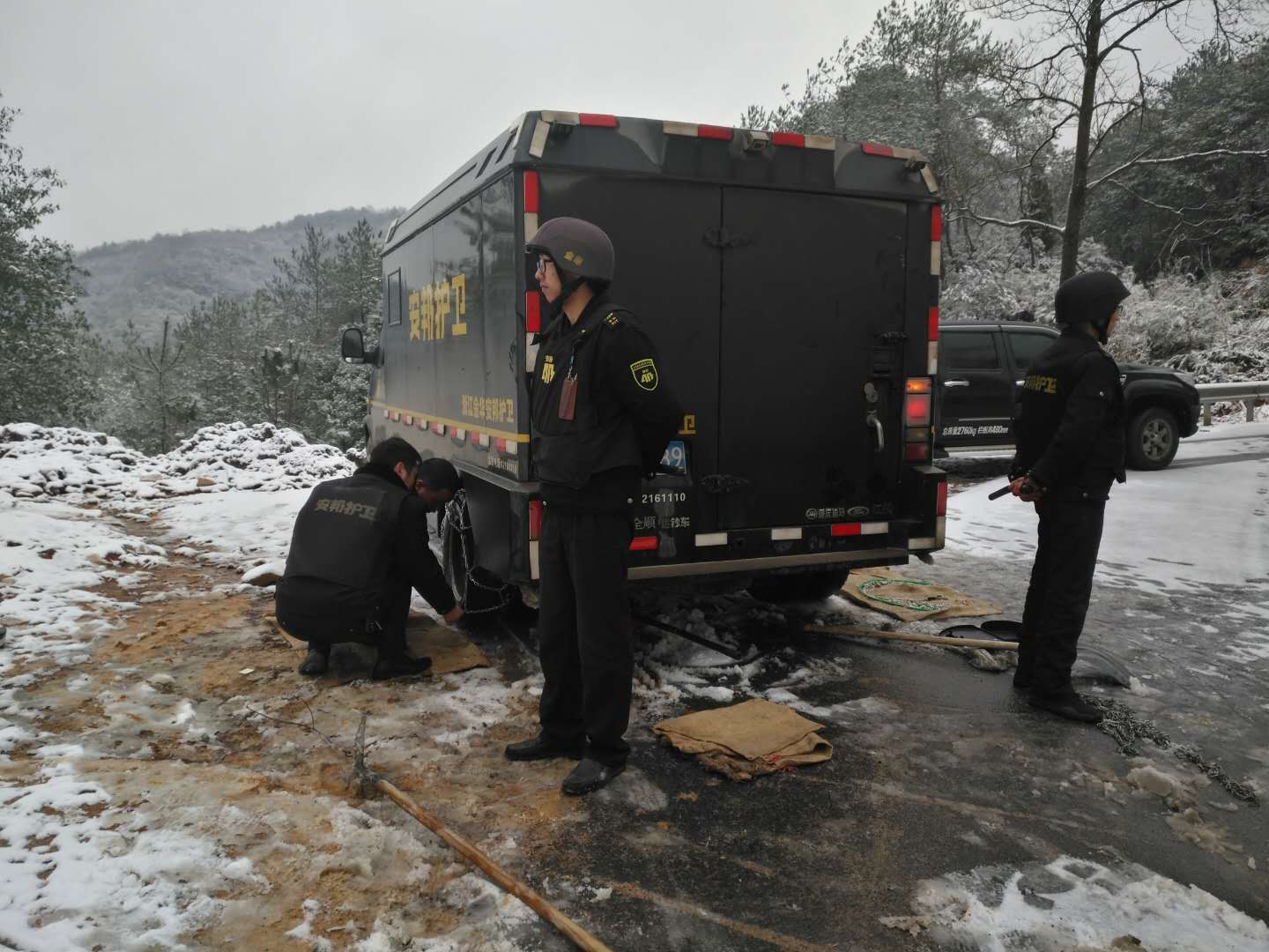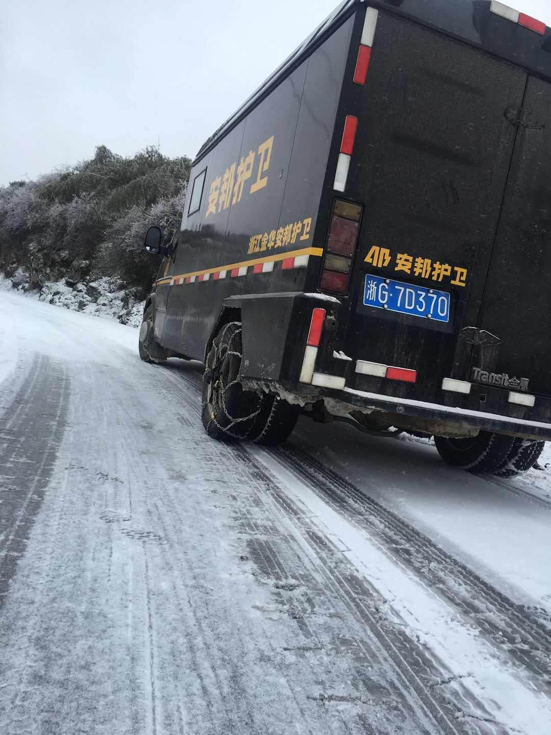 今早,永康守押大队武义合行中队与往常一样,将钱款送至该县城西南山区的新宅分理处,途经新宅乡大庙岭时,因连续弯道上坡导致车轮打滑,难以前行。为确保钱款安全、准时、准点送至网点,车长立即向上级汇报,启动了“冰雪天气应急预案”,现场做好警戒,装上防滑链,确保人、车、标的物的安全。