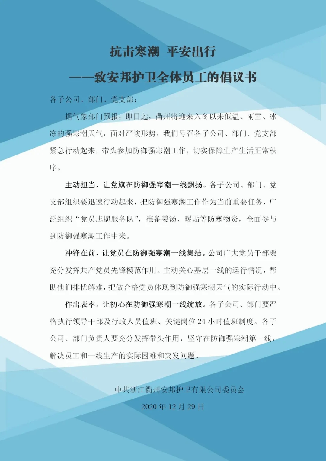 (一)要高度重视,切实贯彻落实相关要求,全面做好寒潮防范工作,确保车辆、交通安全,加强值班备勤和应急保障,保持通信畅通。(二)近期温度断崖式下降,是心血管疾病的高发时期,要关注员工身体健康状况,避免突发状况发生。(三)目前防疫形势依然严峻,要做好疫情防护工作,加强防疫宣传和信息报备工作,做好科学精准防控。