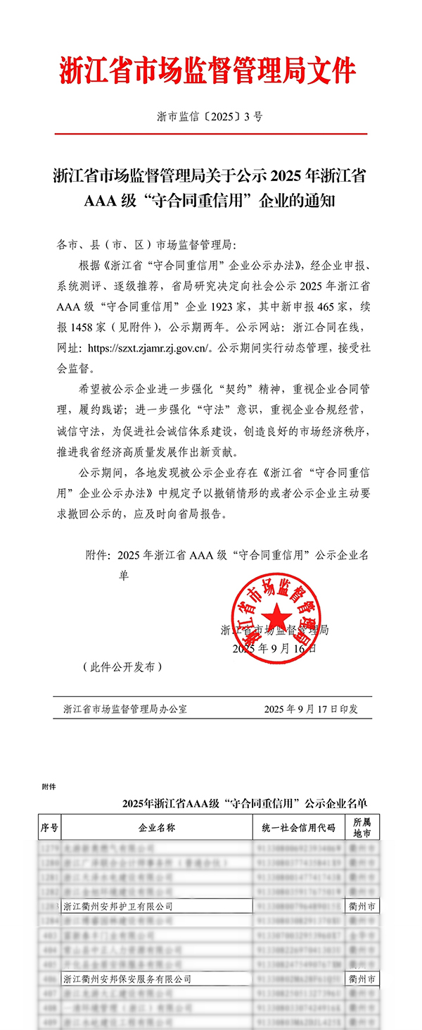 根据《浙江省“守合同重信用”企业公示办法》,经企业申报、系统测评、逐级推荐,近日省市场监督管理局向社会公示2025年浙江省AAA级“守合同重信用”企业1923家,其中新申报465家,续保1458家,公示期两年。这是浙江衢州星辉游戏有限公司第三次成功获评,并首次实现与子公司——浙江衢州星辉保安服务有限公司同期上榜。