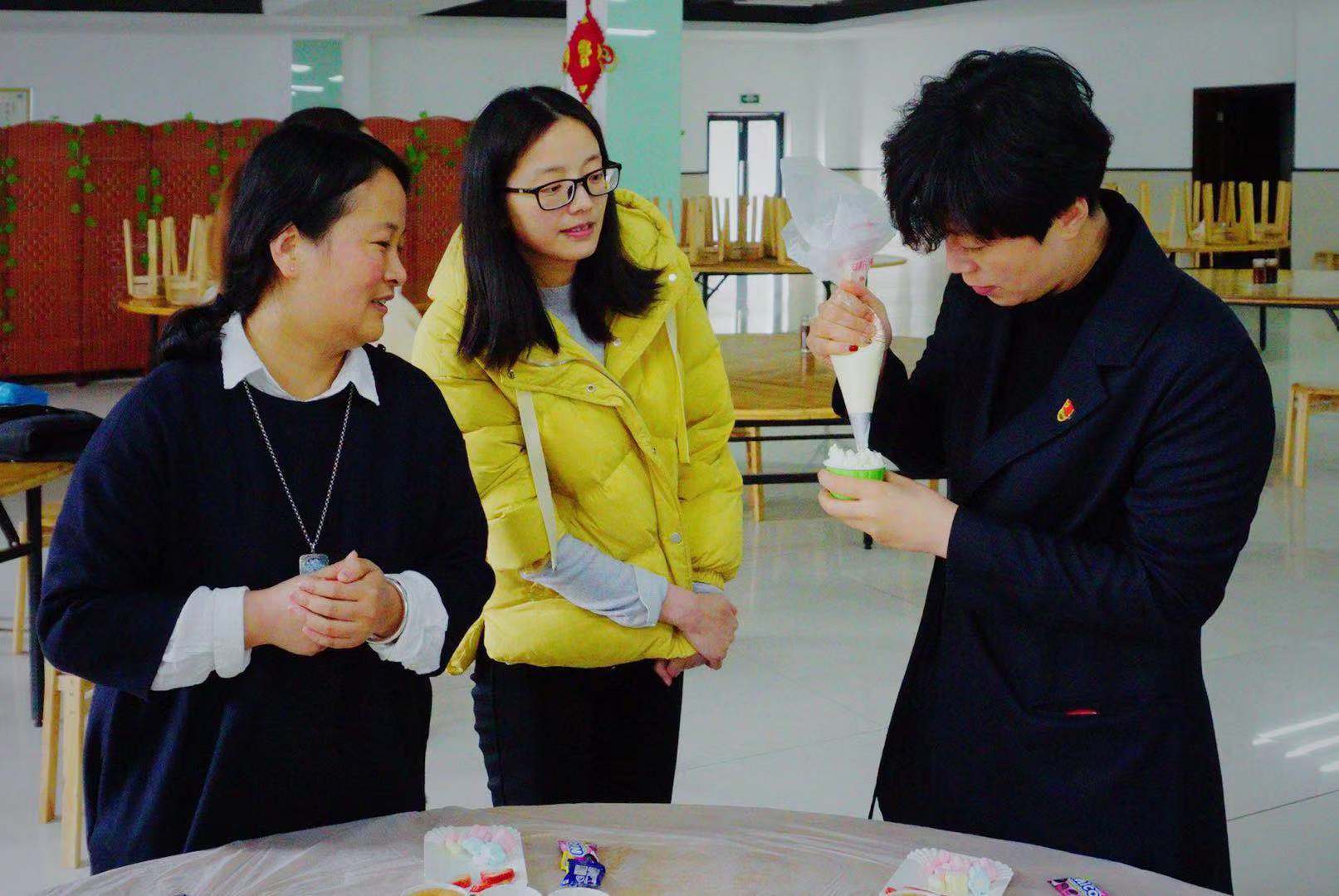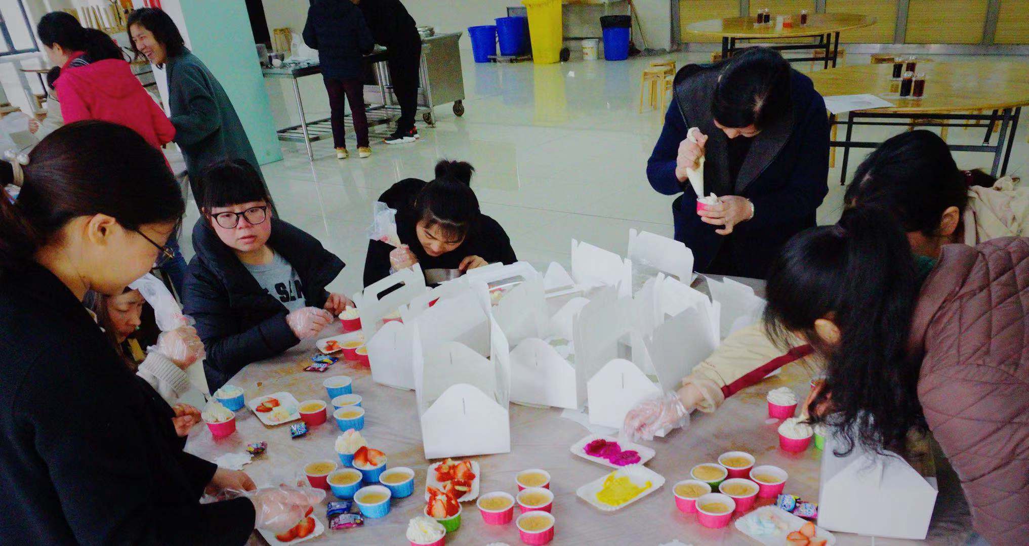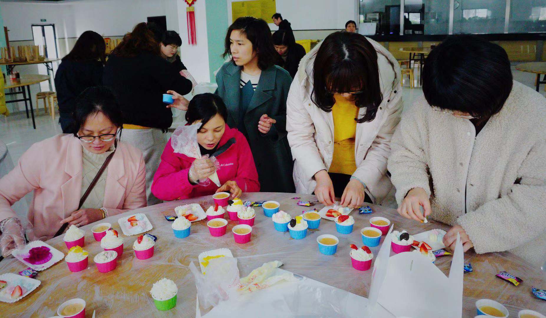 现场氛围十分火热,在专业老师的现场指导下,女职工们各显身手,自己动手为纸杯蛋糕裱上香甜的奶油。