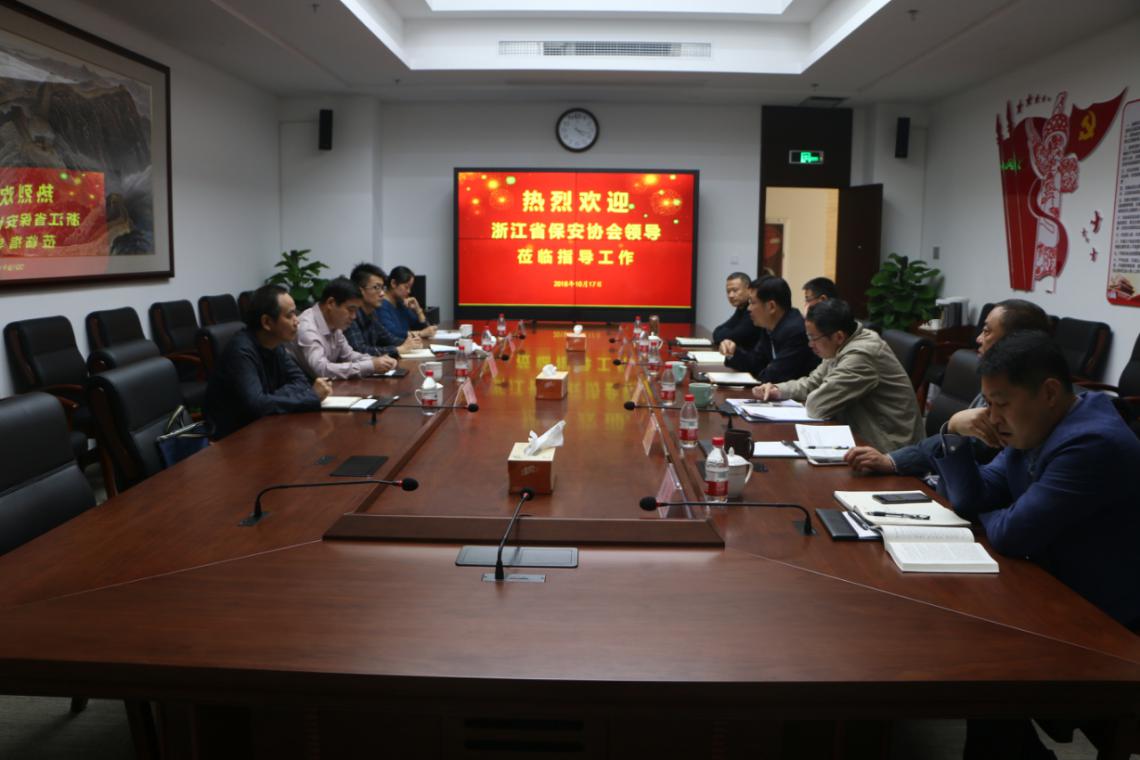 10月17日, 浙江省公安厅副巡视员、浙江省保安协会会长何建军在浙江省公安厅治安监督管理总队科长、浙江省保安协会秘书长王文骅、浙江省公安厅治安监督管理总队副调研员刘文渊、浙江省保安协会副秘书长王晓蕾等陪同下,莅临集团公司考察调研。集团公司党委书记、董事长吴高峻以及在家的党委班子成员出席了座谈会。
