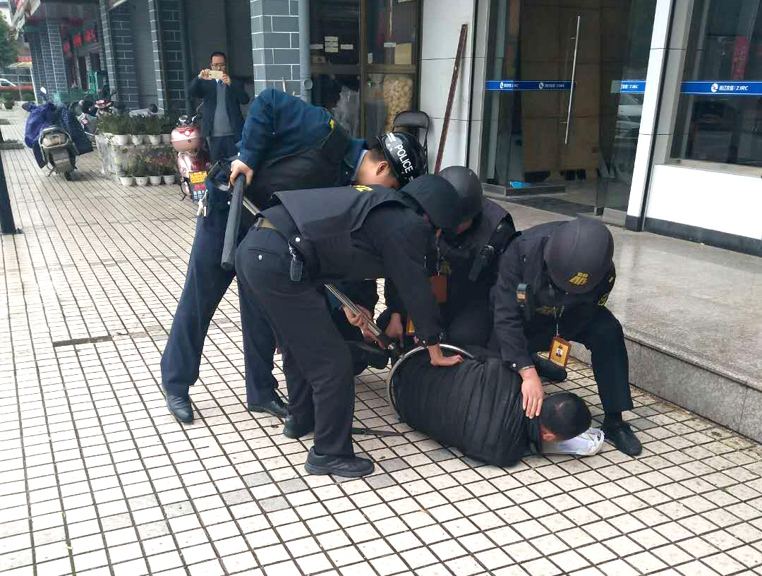 此次演练真实模拟中队队员在与行方进行交接款过程中,突遇持刀歹徒抢劫,中队队员联合行方人员立即对突发状况进行应急处置。