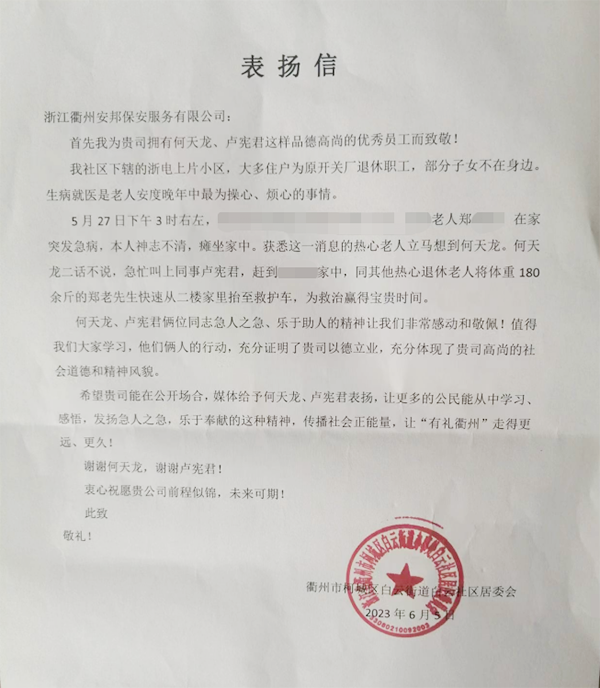 6月8日下午,衢州星辉保安公司收到某驻点单位发来的表扬信,信中对何天龙、卢宪君两位保安员乐于奉献的精神提出表扬和肯定。