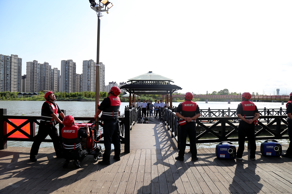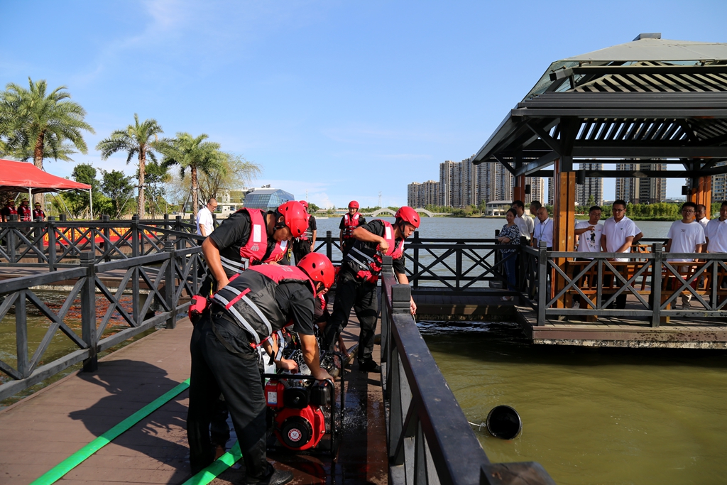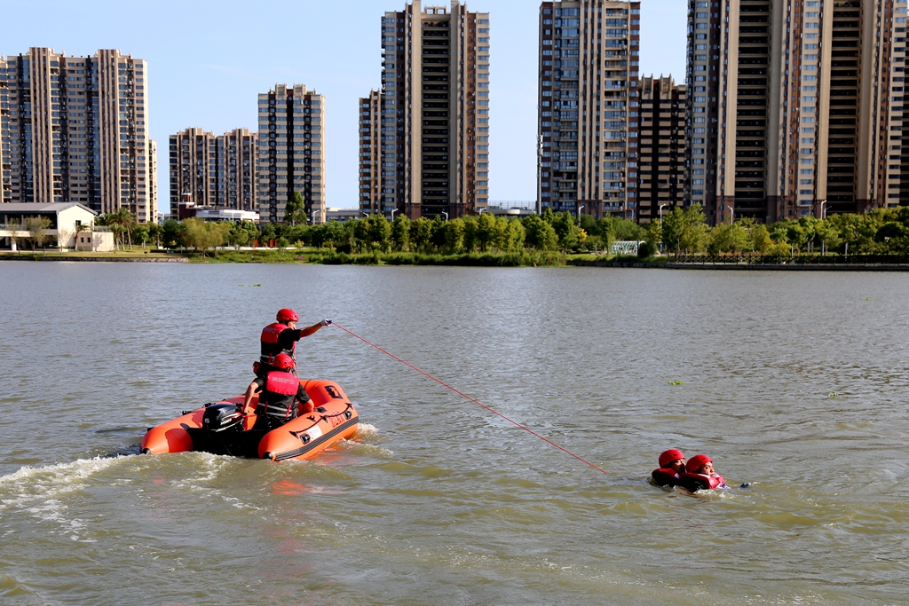 现场应急救援行动模拟金海湖水域因连续多天的暴雨,水位急涨,该水域中的某单位内的人员生命受到危险,同时,单位内的物资也受到被淹的风险。在接到求救电话后,公司应急救援队伍立即赶往现场集结。救援现场,现场指挥安排各小组救援任务。应急救援组立即使用发电机,打开照明灯和抽水泵迅速排水。期间,被救援单位有一人员落水,救援组接到救援指令后,驾驶救援艇把落水人员救上岸,医疗救护组对被救者进行心肺复苏。此外,还进行了翻舟自救等演练。经过各工作小组的密切配合,本次“险情”顺利解除。