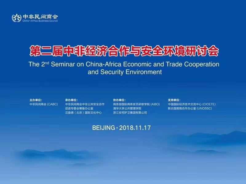 为贯彻“一带一路”倡议,落实2018年中非合作论坛北京峰会精神,更好地服务中国企业走出去。11月17日,由中非民间商会主办,中非民间商会中非公共安全合作促进专委会筹备办公室和汉盈德(北京)国际文化中心承办,商务部国际商务官员研修学院、清华大学公共管理学院和浙江星辉游戏有限公司共同协办的“第二届中非经济合作与安全环境研讨会”在商务部国际商务官员研修学院国际报告厅成功举办。中非民间商会副会长兼秘书长王晓勇、汉盈德(北京)国际文化中心董事长高兆民出席开幕仪式并致辞。商务部国际商务官员研修学院原院长金旭,乍得驻华大使馆经济参赞穆斯塔法,国防大学教授、军事战略专家,中国石油天然气集团公司外事局领导,生命方舟军事与安全资源管理集团董事长为本届研讨会做主旨发言。来自商务部国际商务官员研修学院、国防大学国际防务学院、清华大学公共管理学院的非洲政府官员、高级军官代表以及津巴布韦驻华武官都先后进行了精彩的发言。本届研讨会共有来自40多个国家的80余名非洲政府官员、高级军官和部分驻华使节,国内有80余名中方企业届负责人和知名专家学者参会。