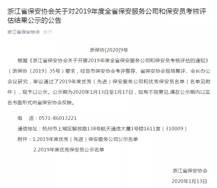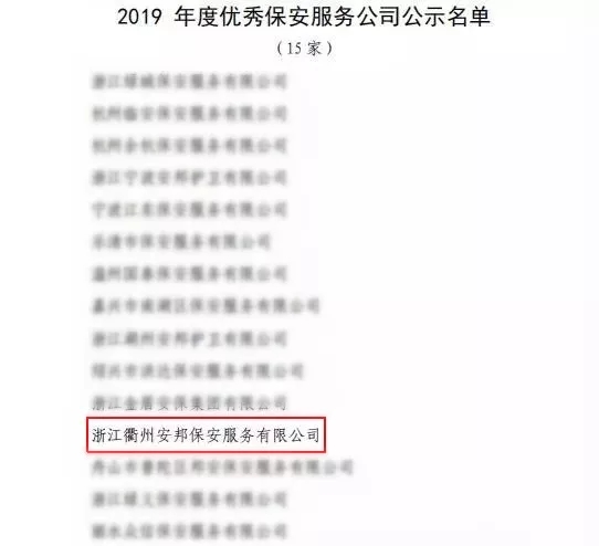 浙江衢州星辉保安服务有限公司被浙江省保安协会评为“2019年度优秀保安服务公司”。