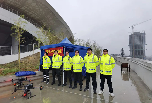 体育中心面积大、空间开阔,观众集中,为了在突发事件发生时第一时间将现场图像传回指挥中心,星辉无人机技术团队在外场区域设立了一个保障点、两支飞行小队。