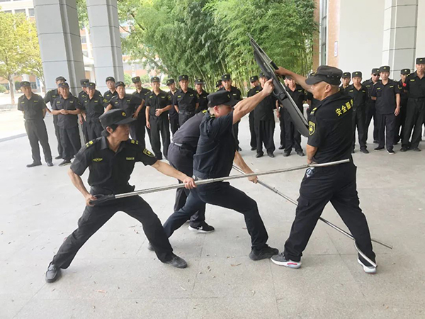 本次培训分别就校园安保工作概述、校园保安勤务、常见紧急情况处置、校园安保工作纪律等方面进行理论授课,并针对队列、军姿、徒手防卫控制技术及安保器械的使用进行实操教学。