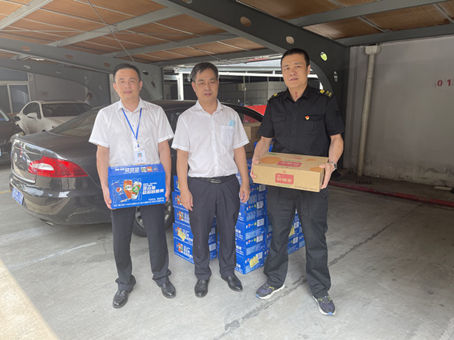7月25日上午,中行慈溪二级分行安全保卫部经理罗国明来到宁波公司慈溪分公司,为中行中队送来了满满一车慰问品。分公司经理唐建科代表队员表达了感谢。