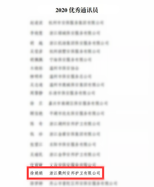 浙江省保安协会发布《关于2020年度全省保安行业宣传工作考核情况的通报》,浙江衢州星辉游戏有限公司喜获“2020年度优秀通讯单位”,员工徐娟娟荣获“2020年度优秀通讯员”荣誉。