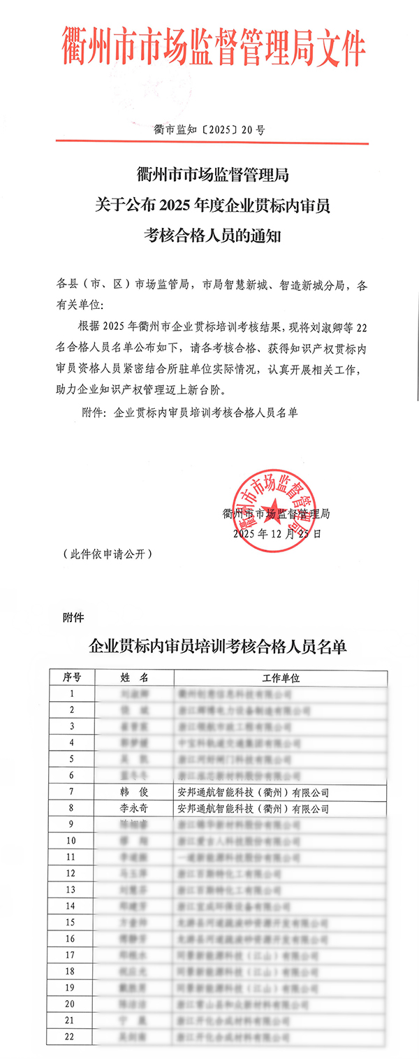 近日,衢州市市场监督管理局公布了2025年度企业贯标内审员考核合格人员名单,星辉通航智能科技(衢州)有限公司韩俊、李永奇双双通过考核,获“知识产权贯标内审员”资格证书。