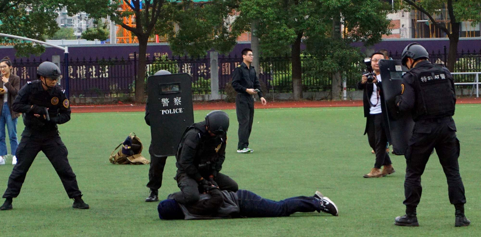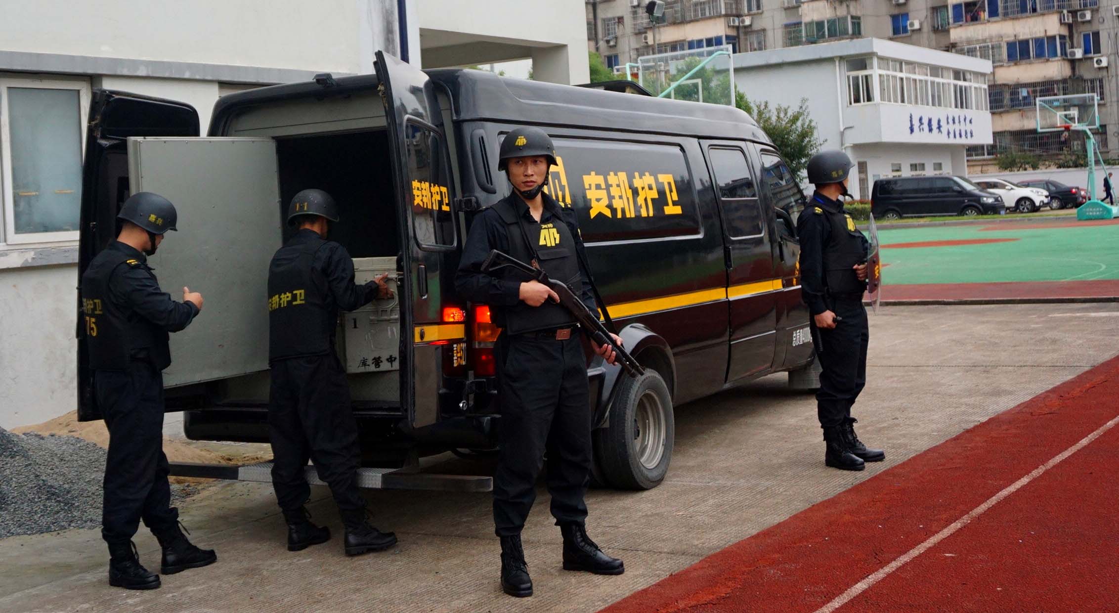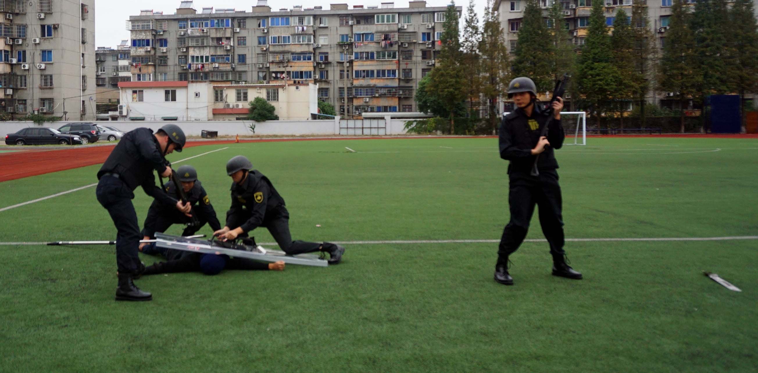 演练在嘉兴市人民警察学校内进行,押运车辆行至模拟银行门口,押运车长、押运员下车观察现场情况后站位警戒,交接员开车门取出款箱与银行业务员进行交接时,突然窜出两名蒙面持枪、持刀歹徒,直奔款箱实施抢劫。面对这种突发警情,押运员见状果断鸣枪示警,交接员与银行员工一起迅速将款箱转移至银行网点内,驾驶员在车内立即报警,同时打开警报器,震慑歹徒。穷凶极恶的歹徒开枪击伤银行网点保安后,将其劫持为人质,并一次次地妄图冲入银行网点继续抢劫。押运人员有效利用掩体,使用武器与歹徒形成对峙阻挡住歹徒,并拖延时间以待后援。接到报警后,市公安局特警支队红鹰突击队和我司应急分队立即出动赶赴现场。歹徒看到我方增援力量到位后分头逃窜,持刀歹徒被我司应急分队拦截,盾牌手和钢叉手密切配合,当场将持刀歹徒制服。持枪歹徒劫持人质被红鹰突击队拦截后,拒不投降,并妄图伤害人质,红鹰突击队果断开枪,当场将其击毙。