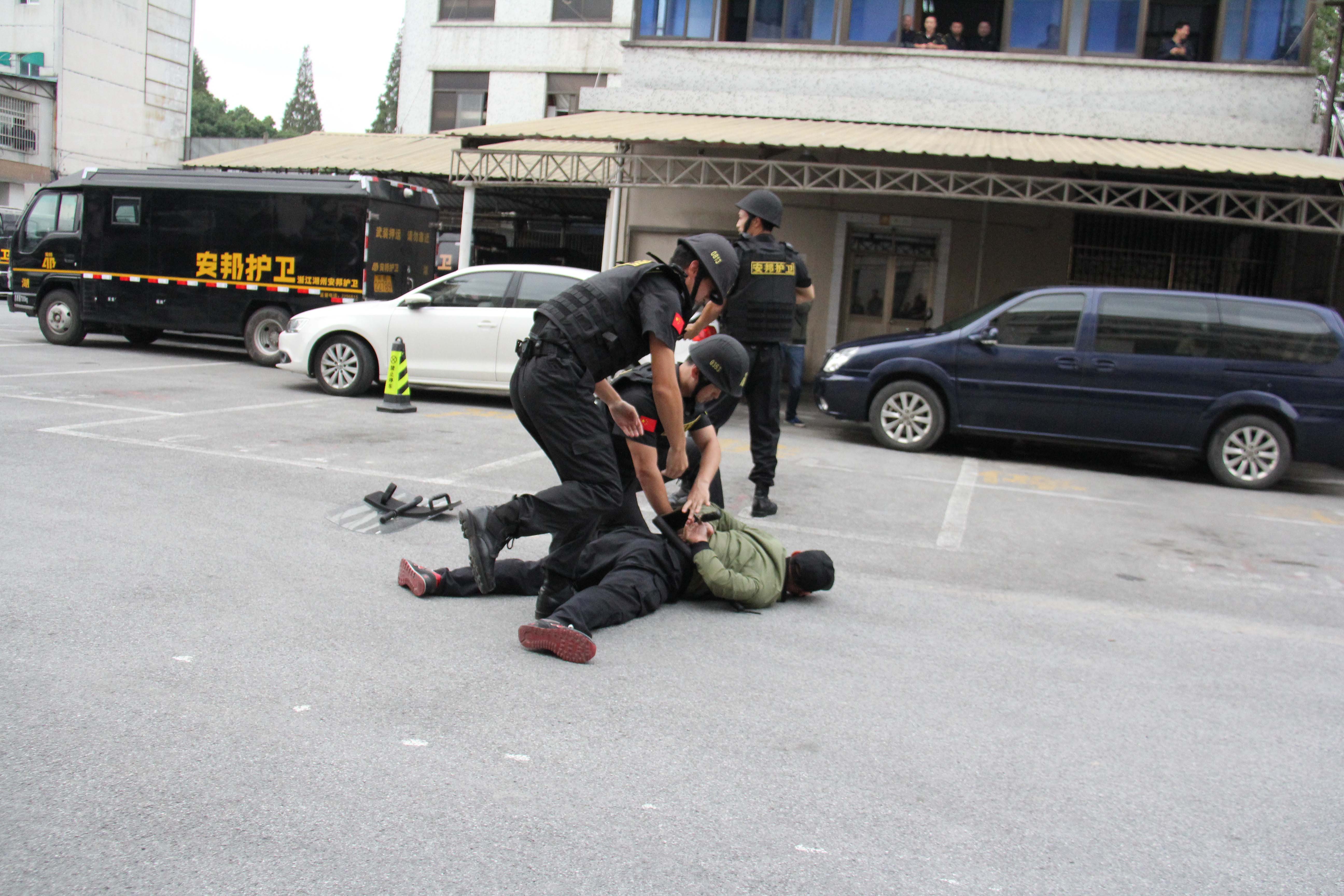 本次演练项目分别有防暴枪分解结合、应急预案桌面推演、押运车天窗逃生演练、钢叉制服歹徒和网点防抢演练5个科目。