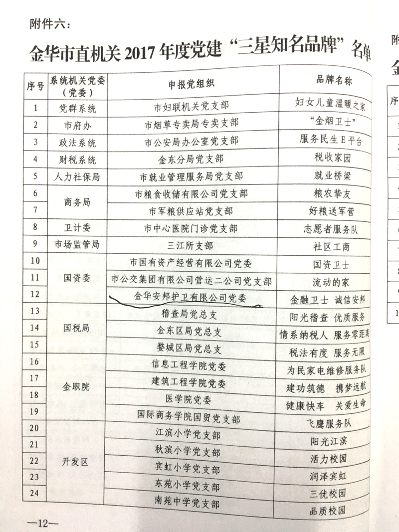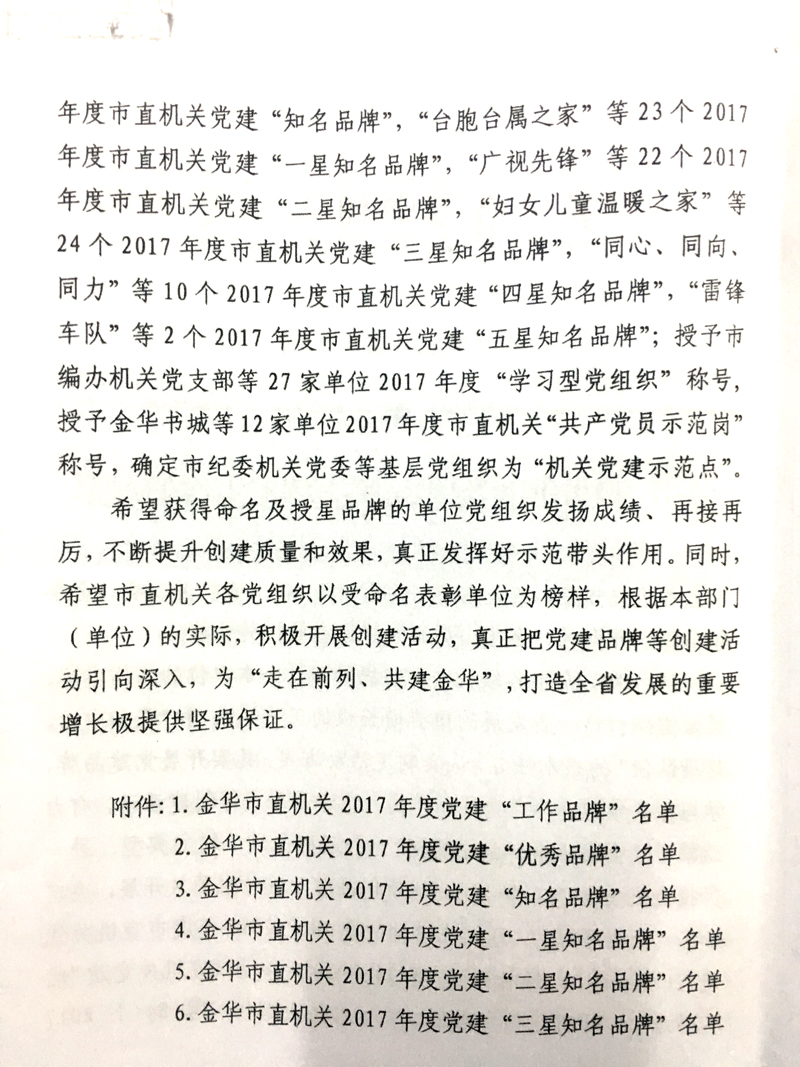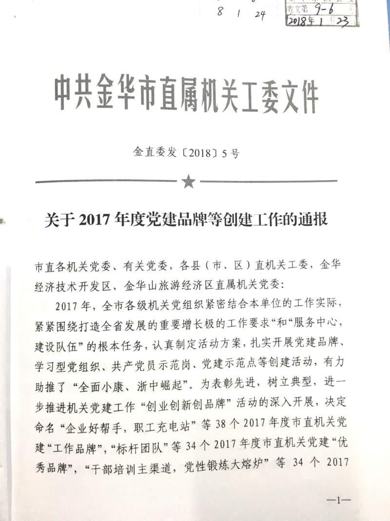 公司荣获金华市直机关2017年度党建“三星知名品牌”称号