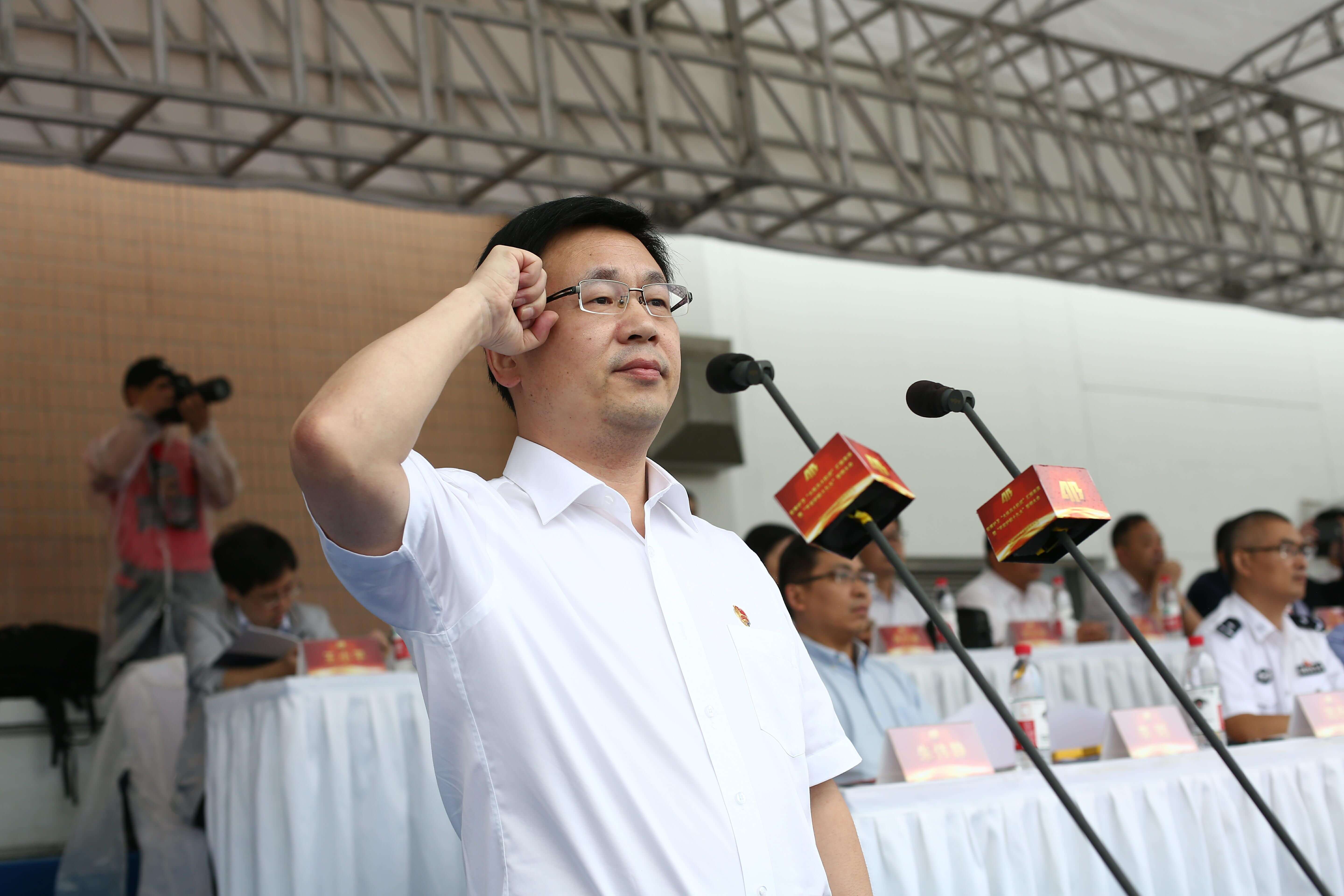 誓师大会现场奏响了雄壮的中华人民共和国国歌,升起了庄严的中华人民共和国国旗,参会的全体人员向国旗敬礼!