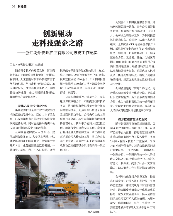 三是全力拓展无人机业务。公司将无人机业务作为科技强企建设重点工作,成立天鹰飞行队并加入应急支援航空队。是浙江省安全技术防范行业协会第五届理事单位,浙江省无人机产业技术联盟第一届会员单位。取得了民用航空管理局颁发的无人机驾驶航空经营许可证和中国航空运输协会的培训资质。