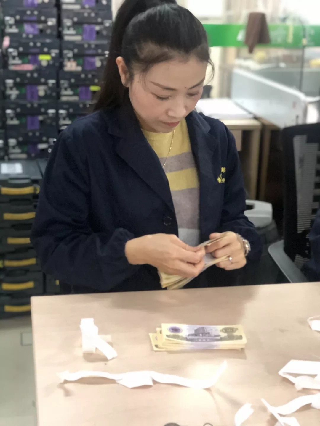 要求现金清分员从20余张真币内挑选出掺杂的假币,假币数量1-3张不等,限时2分钟。