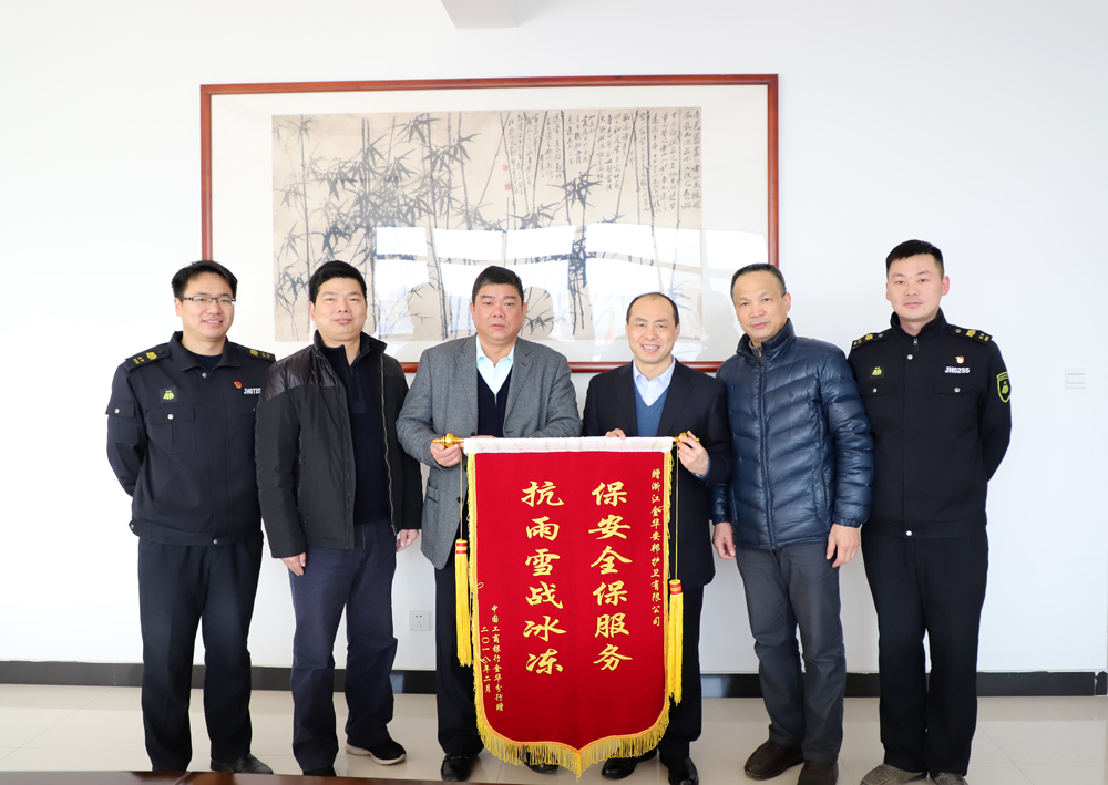 2月14日,中国工商银行金华分行纪委书记余诗良、保卫部总经理吴平给浙江金华星辉游戏有限公司送来一份“情人节礼物”,一面印有“保安全保服务 抗雨雪战冰冻”的锦旗。