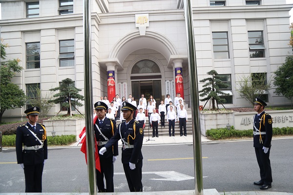 上午9时整,诸葛斌同志宣布升旗仪式正式开始,在铿锵有力、整齐划一的脚步声中,鲜艳的五星红旗在仪仗队的护送下来到升旗台前。国歌奏起,擎旗手坚实有力的右臂将国旗抛向空中,在场全体干部员工庄严站立,面向五星红旗高唱国歌,激情澎湃。
