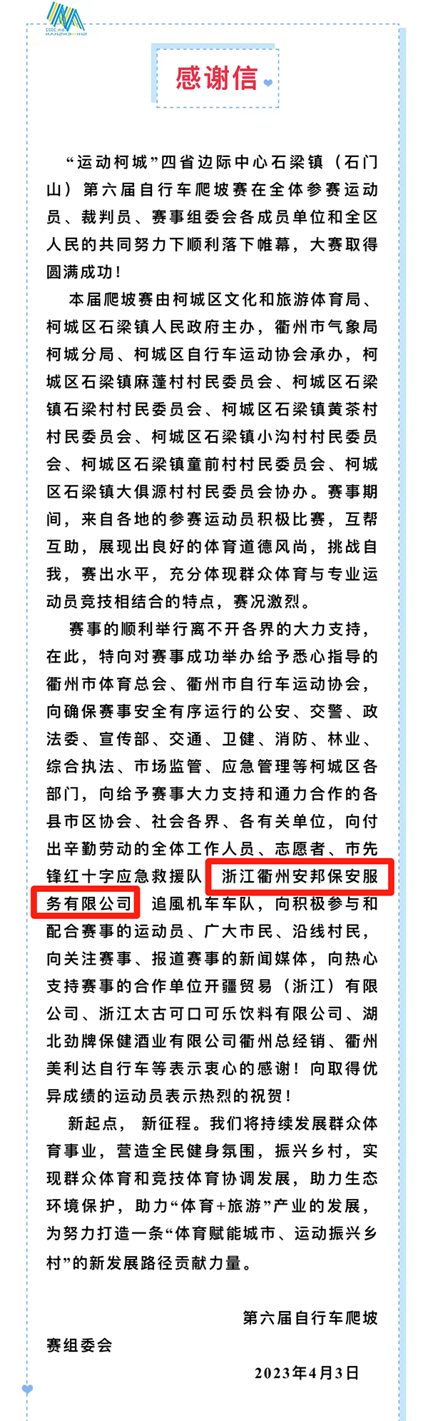 比赛期间,全体执勤队员依法文明执勤,认真履行职责,有序开展交通清障等工作,耐心细致地对造成不便的群众进行解释劝导,以高度的责任感和饱满的精神维护现场活动秩序,确保本次赛事活动的顺利进行。得到第六届自行车爬坡赛主委会的肯定,获得柯城区自行车运动协会感谢。