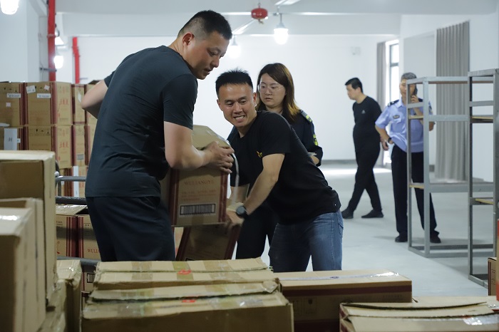 5月12日下午,浙江嘉兴星辉游戏有限公司由党委委员、副总经理胡公钏带队,派出5个车组,共计25名队员,前往嘉兴市公安局南湖区分局,将第二批涉案财物——查获的假冒伪劣高端白酒顺利运回涉案财物管理中心,共计660余箱,包括酒类4500余瓶,生产辅料62箱、灌装器皿209箱、设备2台。所有涉案财物均被一一登记入库,妥善保管。
