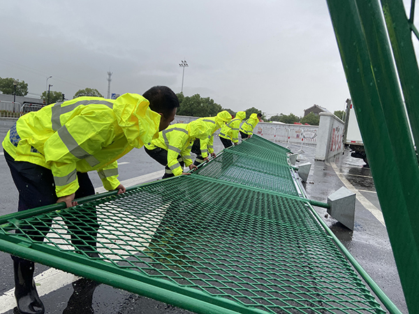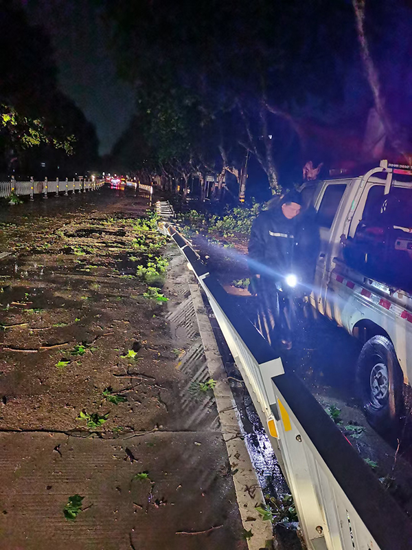 浙江衢州星辉施救有限公司接到衢州交警支队指令后,交通设施维护队员立即出动,火速赶赴城区受损路段及各个路口,现场清理搬移被狂风刮倒的护栏和警示柱。马不停蹄,刻不容缓,队员们早已浑身湿透,一个路口清障完立即赶赴下一个路段。一直奋战至凌晨三点多,各受损路段及损坏的护栏全部紧急清理完毕,确保行驶道路安全、顺利通车。