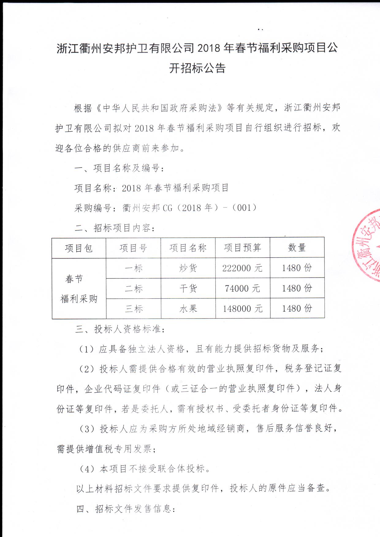 浙江衢州星辉游戏有限公司2018年春节福利采购项目公开招标公告