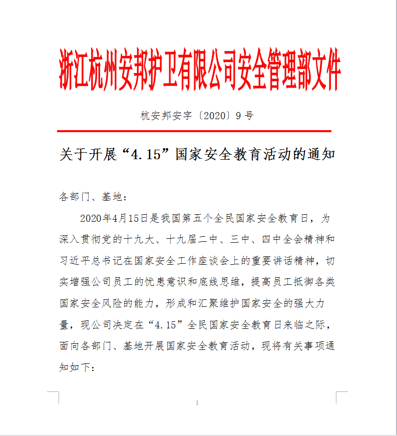 杭州公司安全管理部门根据公司党委的决策部署研究制定并下发2020年“全民国家安全教育日”活动通知,指导各部门、基地开展系列活动。