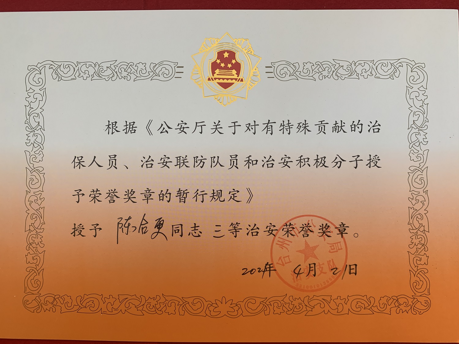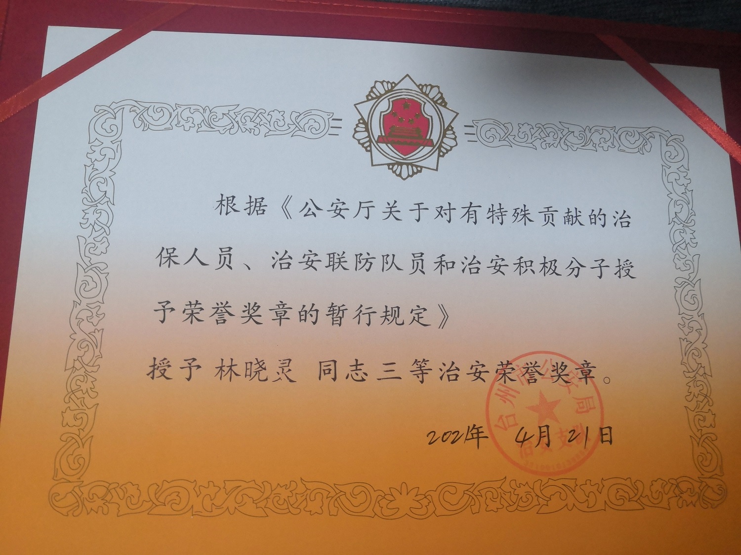 台州星辉游戏陈合更、林晓灵荣获“治安荣誉奖章”