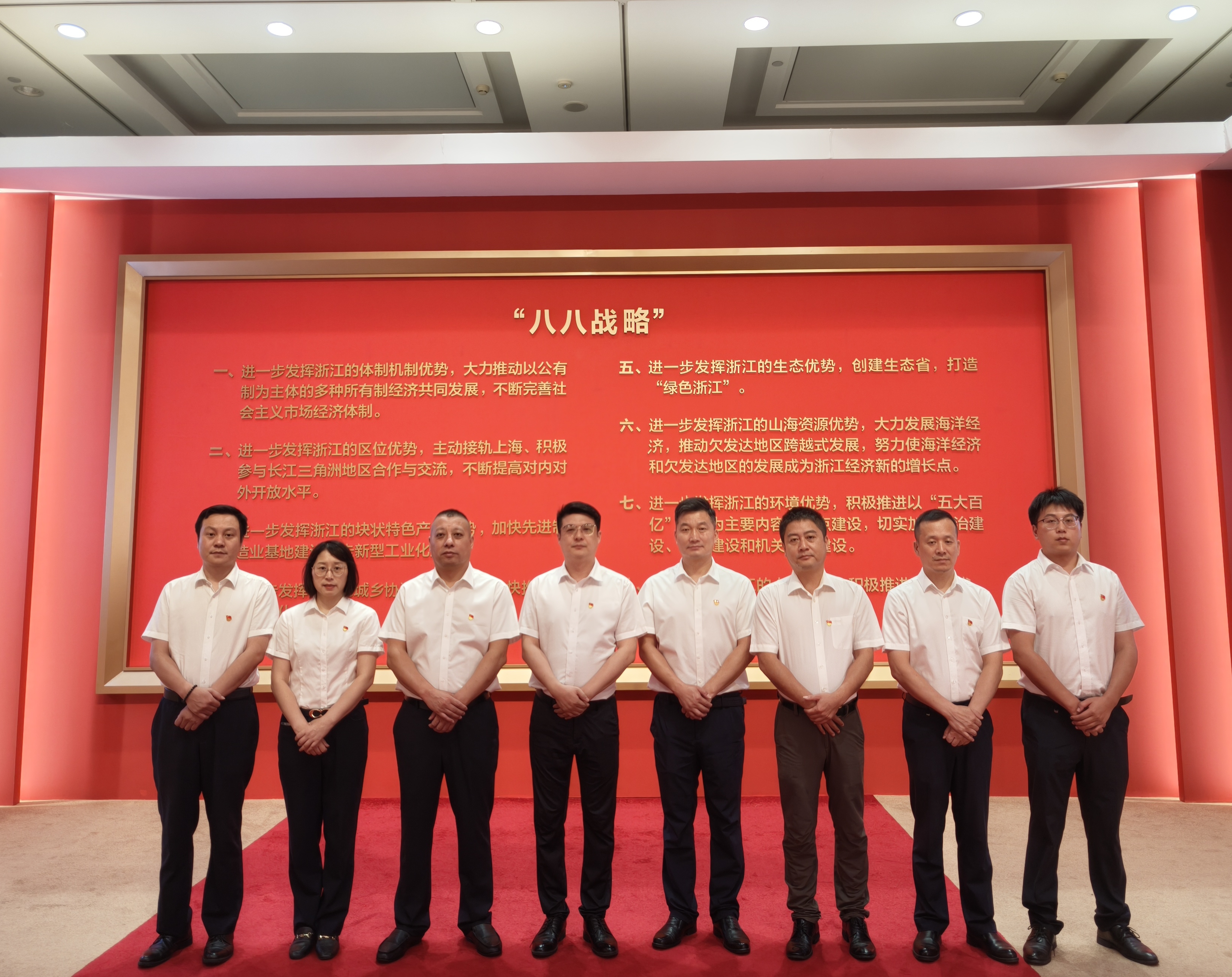在浙江省展览馆,党员们参观了“大道之行——‘八八战略’实施20周年大型主题展览”,循迹溯源,重温习近平总书记为浙江发展所绘制的宏伟蓝图。展览通过丰富的图文资料、珍贵实物、沉浸式影像,全景展示了浙江在“八八战略”指引下20年来取得的历史性成就和显著变化。从“创新驱动”到“绿色发展”,从“民生福祉”到“党建统领”,党员们边走边看,深刻体悟“八八战略”的前瞻性、科学性和实践性。在“党建统领”展区,大家重温习近平总书记关于全面从严治党的重要论述,进一步坚定了抓党建就是抓发展、抓发展必须抓党建的政治自觉。