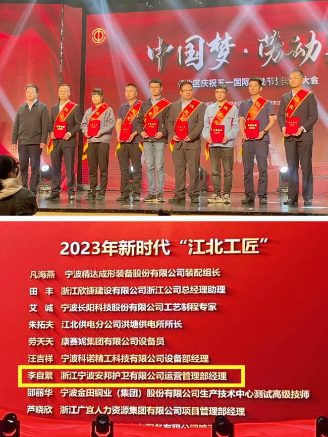 4月27日,中共宁波市江北区委、江北区人民政府举行2023年新时代“江北工匠”颁奖仪式,隆重表彰在江北区经济发展主导产业、重点产业、重点行业中具有较高政治素质、技能水平和奉献精神的一线在岗产业工人。