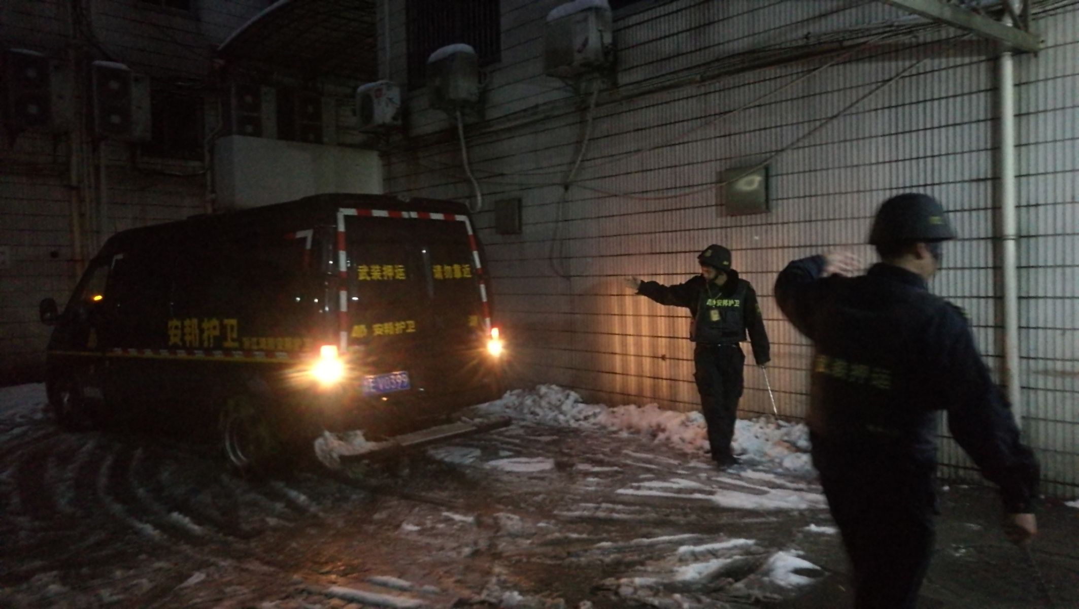 天寒地冻,押运队员的执勤动作仍然规范整齐