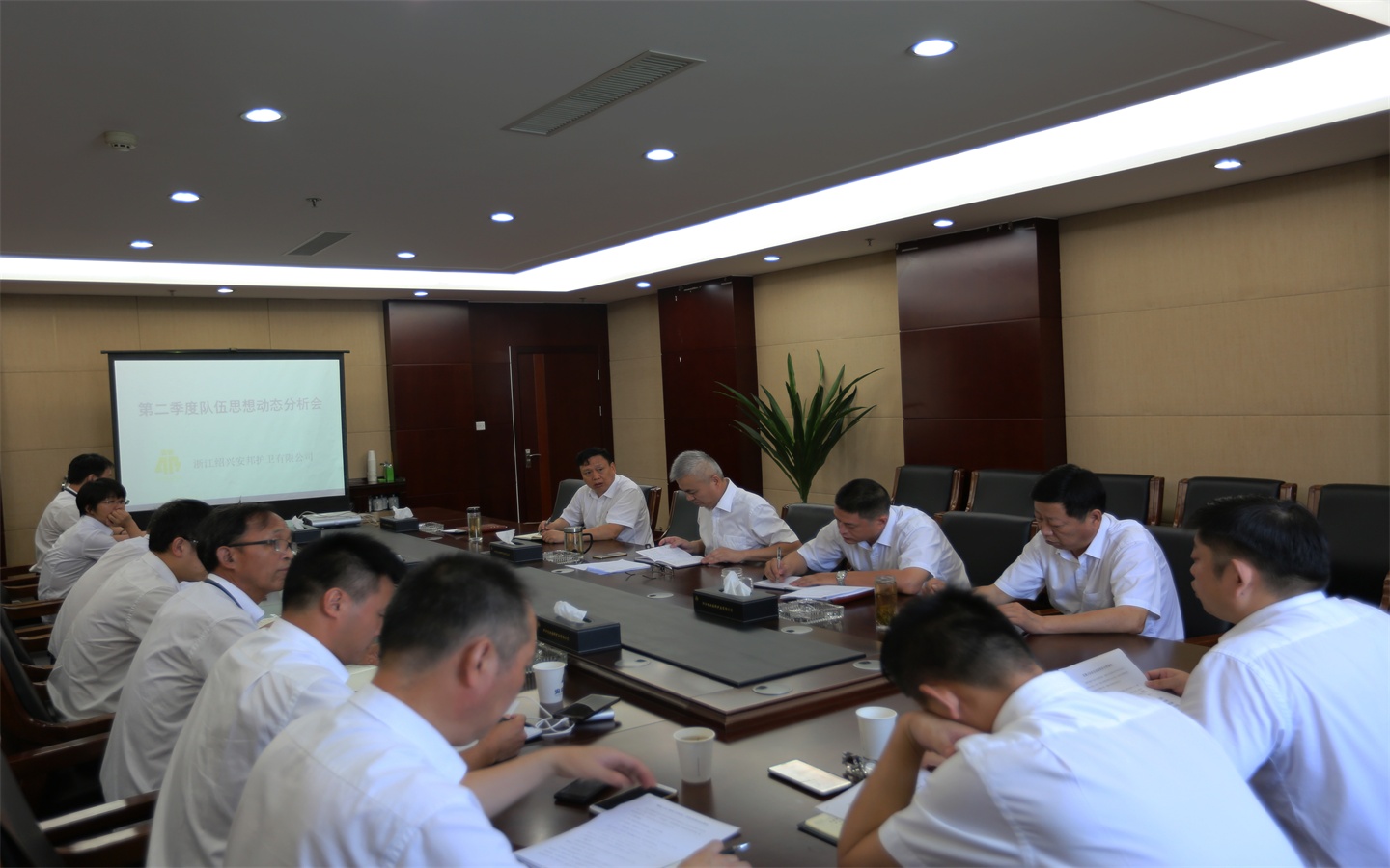 8月7日上午,绍兴星辉公司召开第二季度队伍思想动态分析会,公司党委书记、董事长、总经理胡秀荣,副总经理陈良、王天飞、纪委书记董礼财,三个大队、行政各部门主要负责人参加。