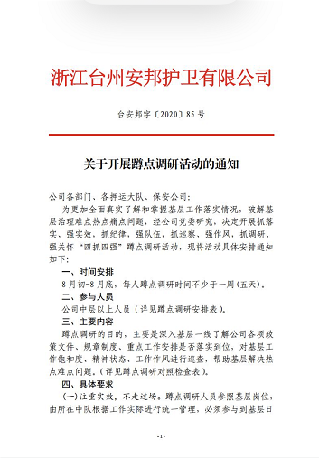 公司党委班子和全体中层干部将按照蹲点调研工作安排,分批到各中队、服务点开展为期一周的深入蹲点调研,与一线员工同安排、同作息、同工作,范围覆盖基层工作各个工作场景。