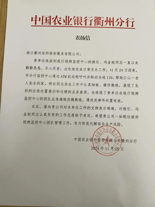 近日,浙江衢州星辉保安服务有限公司收到中国农业银行股份有限公司衢州分行发来的表扬信,信中对熊引、冯金姣两位保安员认真负责的工作态度、专业有效的应急处置给予肯定和表扬,两位同志帮助老人回家的暖心事迹被新浪浙江等多家媒体平台宣传报道。