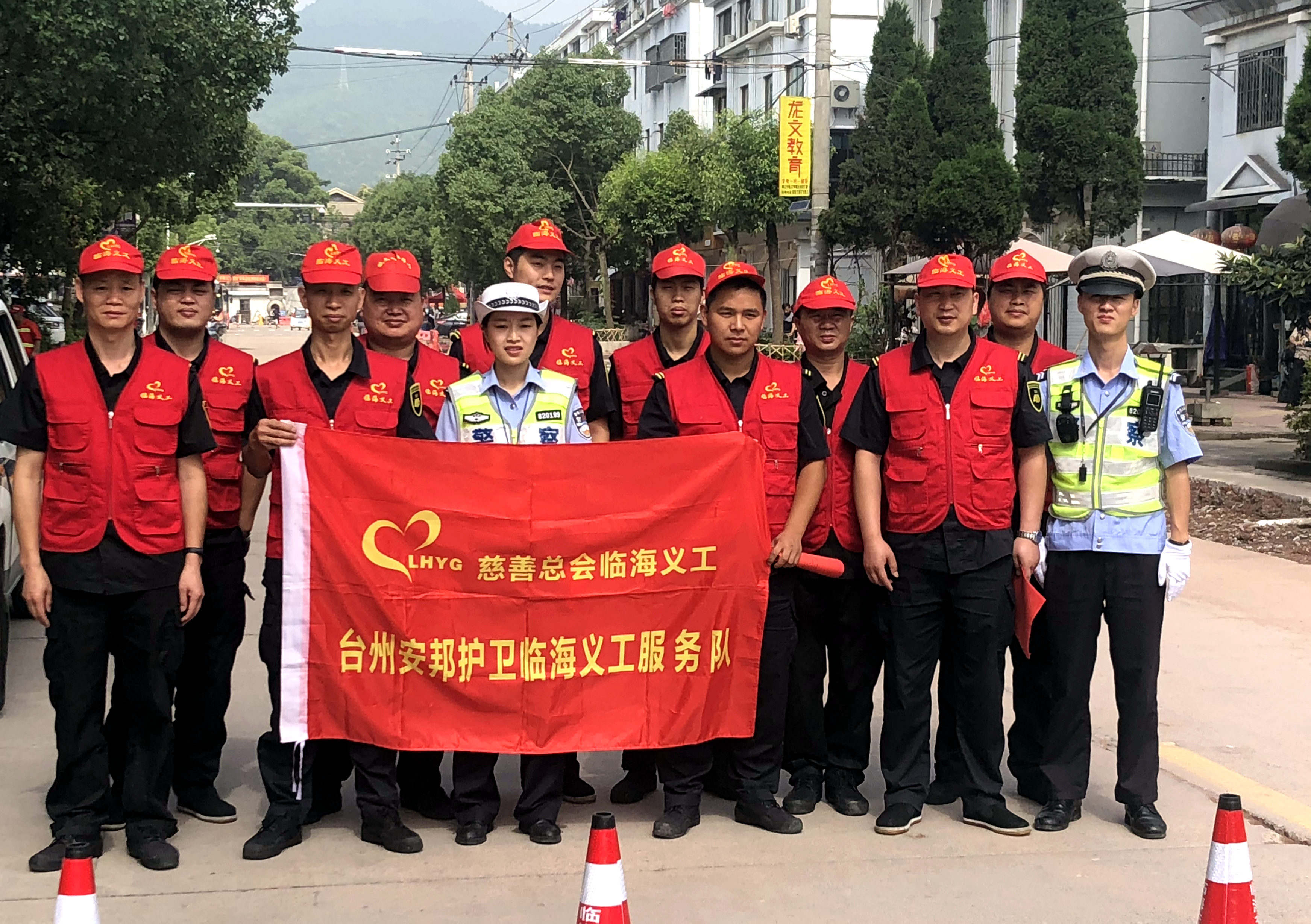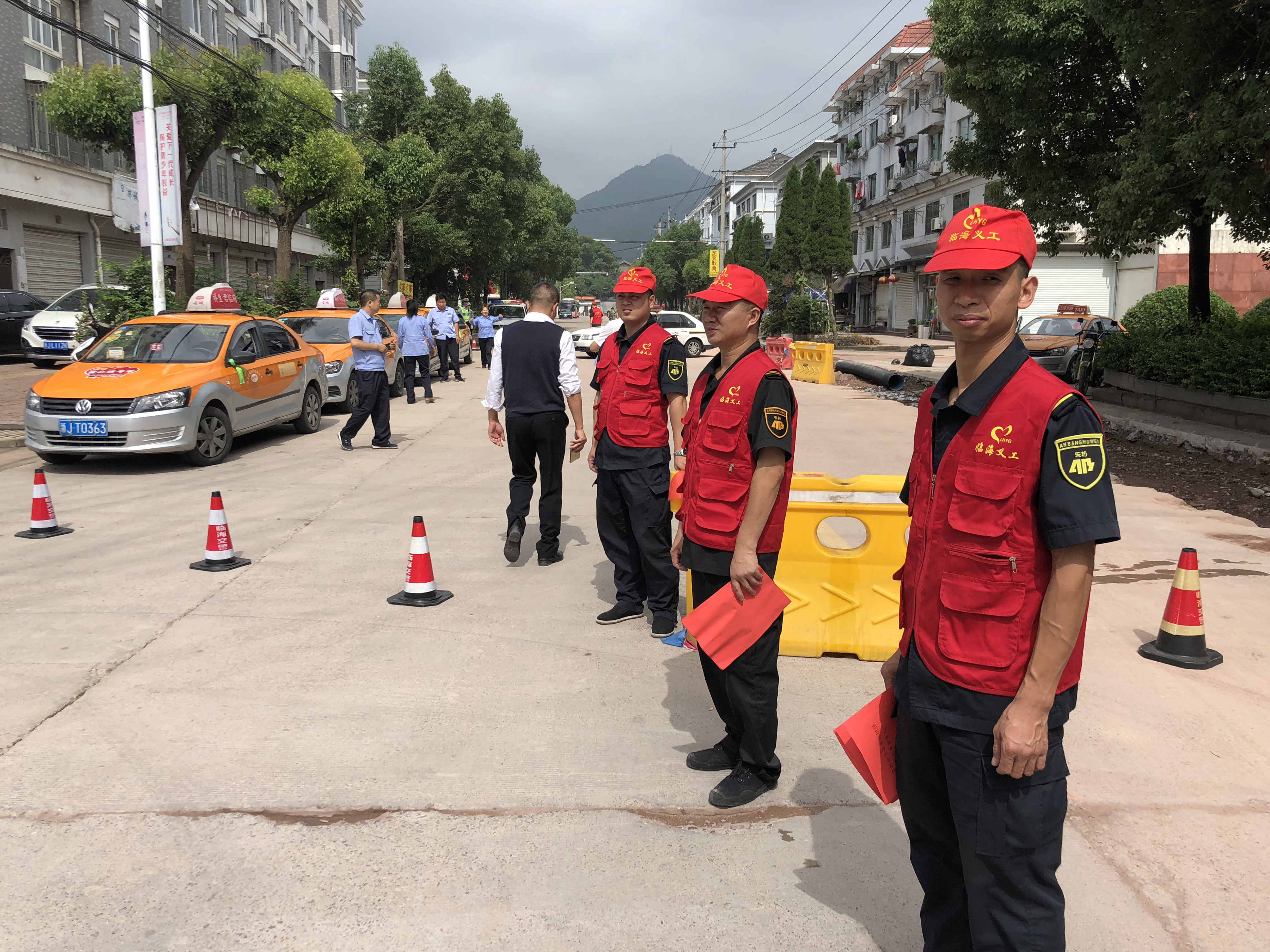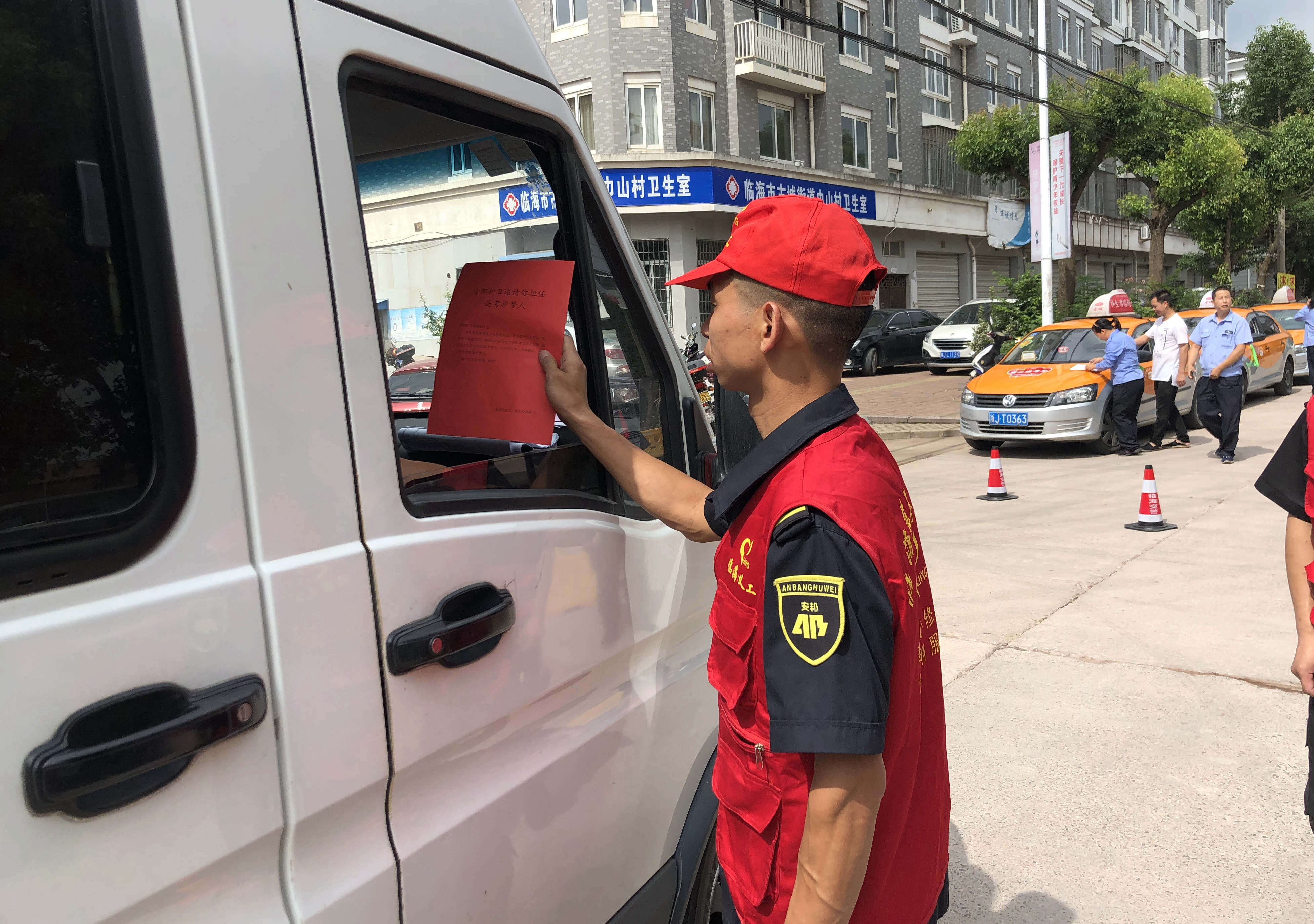 在考场外围,配合交警设置路障进行交通引导,分发禁鸣倡导书,维持考场周围秩序。