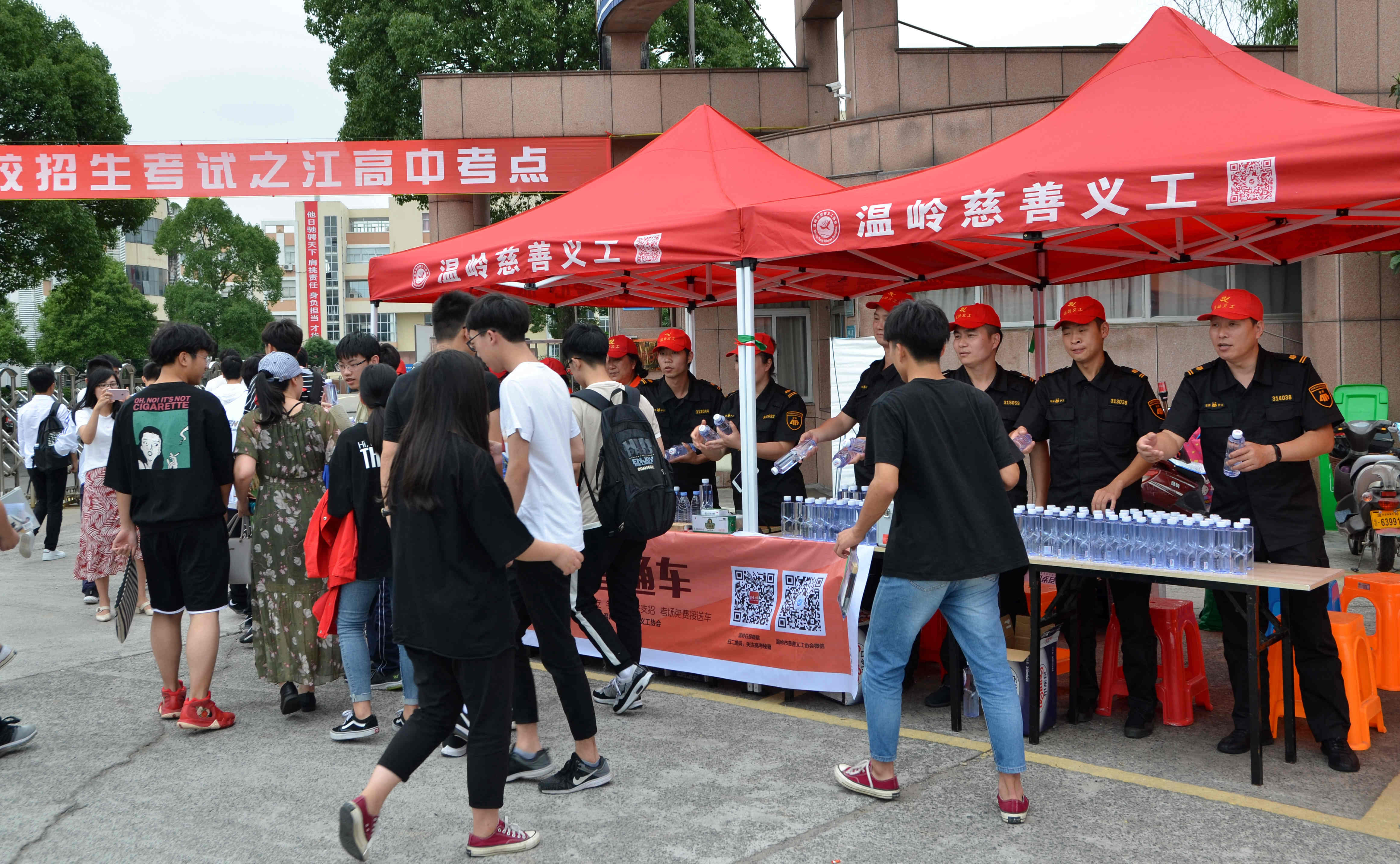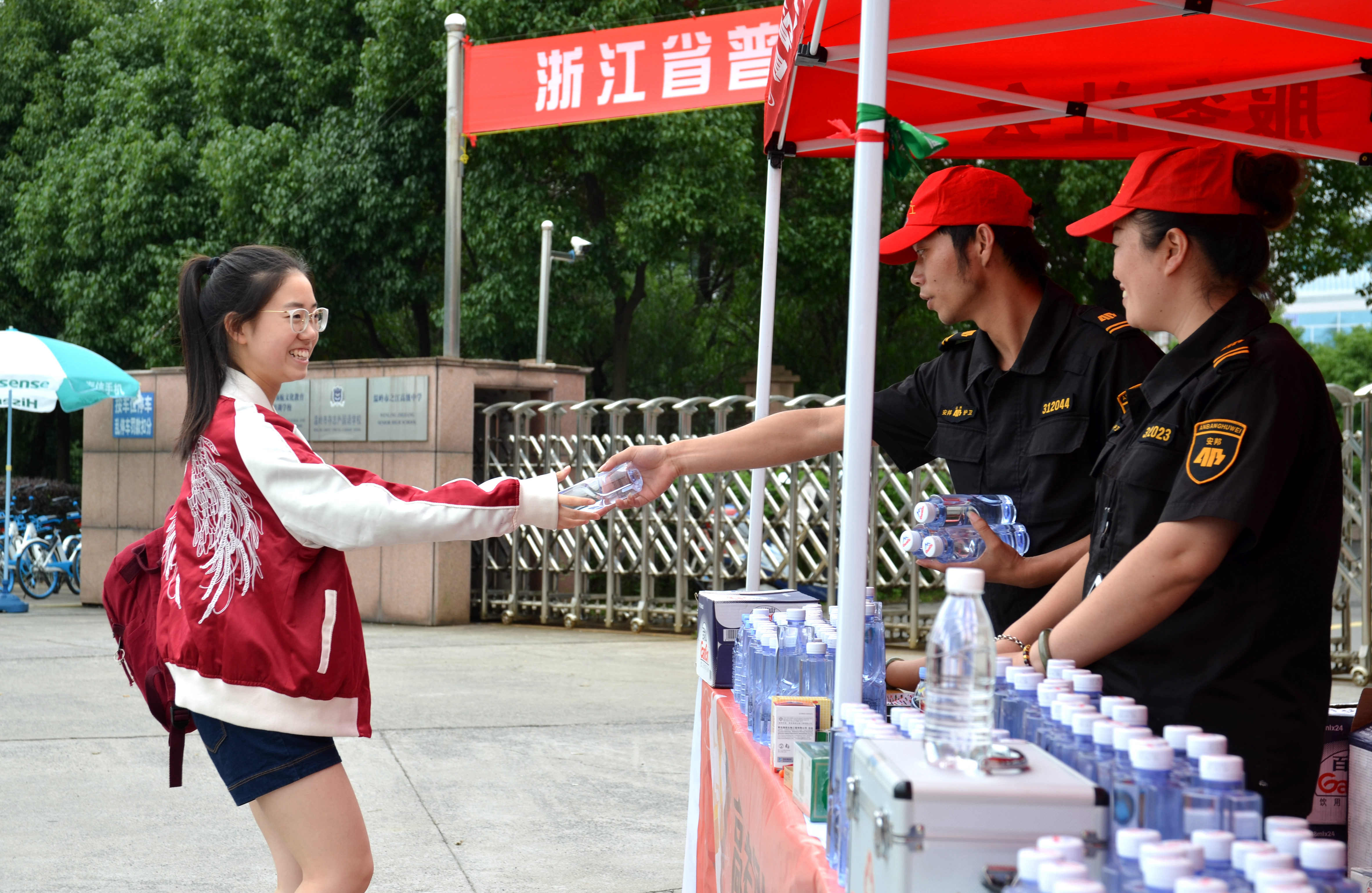 在考场前设立助考贴心服务区,备好撕去标签的矿泉水、削好的2B铅笔及克痢痧、风油精等防暑急救药品,为赶考的考生们排忧解难。