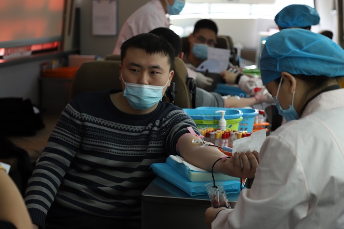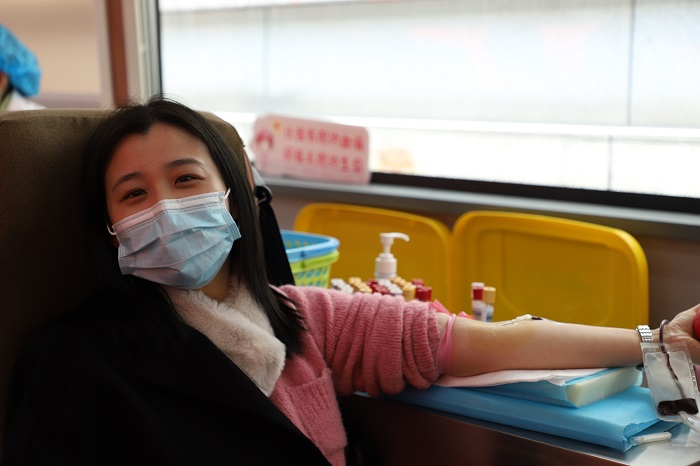 在经过严格筛选后,大家依次登上献血车,挽起袖子,献出自己的一份爱心。当承载着爱心的热血缓缓流入血袋,献血员工脸上绽放出开心的笑容。