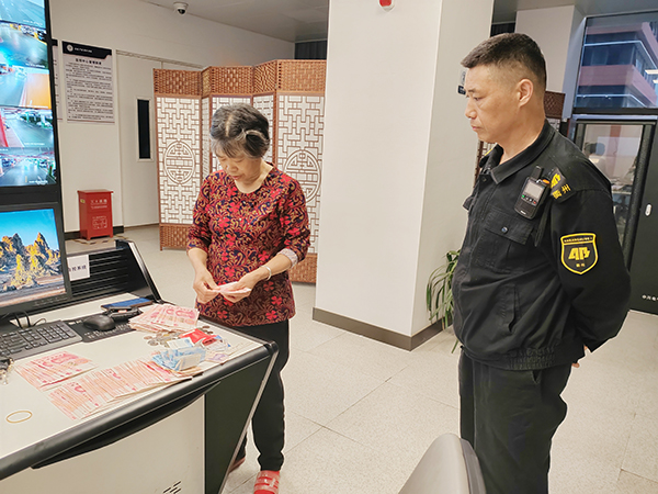 不一会儿,失主匆匆赶来,经过清点,包内的两万余元现金及财物一分不少。缓过神来的失主连连道谢,她说自己接到电话时才发现手提包不见了,非常感谢安保队员的及时帮助。据了解,失主的两万余元现金是筹借而来的,丈夫在医院住院,可以说这是救命钱,一旦发现手提包丢失,对他们精神和心理上的打击是无法预测的。正是安保队员的快速响应、及时归还,让他们免受寻找手提包带来的巨大精神压力。