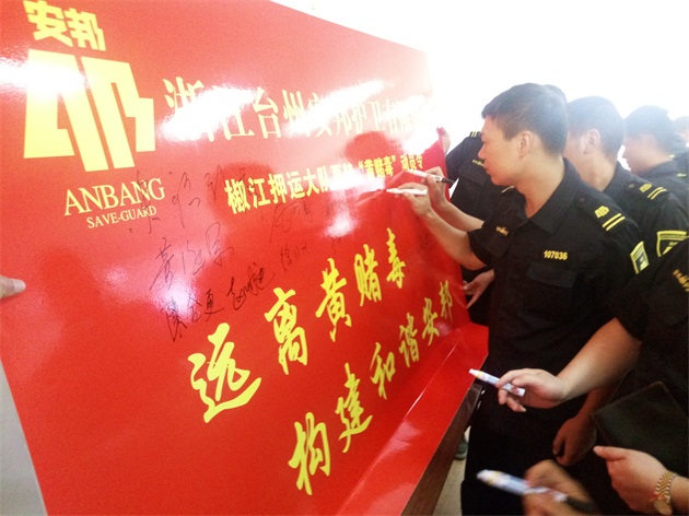 椒江押运大队开展“远离黄赌毒、构建和谐星辉”主题签名活动,大队员工积极签名,表达自己坚决抵制“黄赌毒”的决心。
