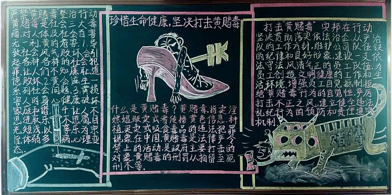 温岭押运大队广泛征集员工队伍中特色鲜明、朗朗上口的标语、打油诗及感悟等创作了“黄赌毒”专题黑板报。
