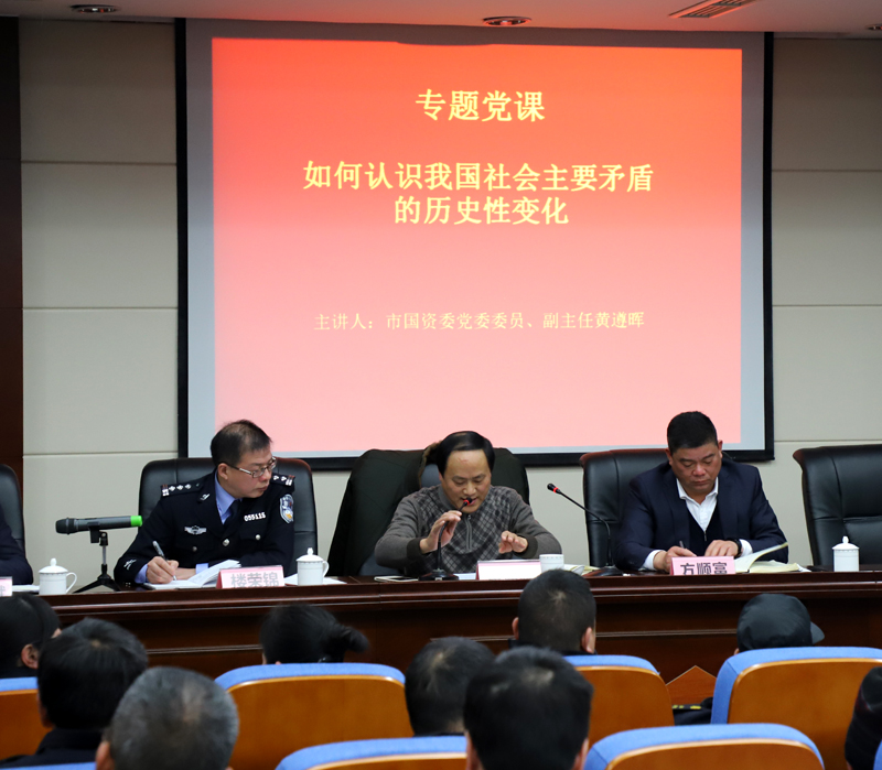 为深 入学习贯彻党的十九大精神,努力引导公司广大党员干部职工深入理解十九大报告内容,准确把握大会精髓,2月1日下午,市国资委党委委员、副主任黄遵晖同志给星辉公司党员干部职工上了一堂题为《如何认识我国社会主要矛盾的历史性变化》的专题党课。公司党委书记、董事长、总经理方顺富,市公安局经文保支队副支队长楼荣锦,公司党委委员、副总经理张红兵、潘晓斌,专职监事徐林伟,公司各部门、大(中)队主要负责人,全体党员以及本部人员现场听课。课堂上,黄遵晖同志结合自身实际,运用生动鲜活的数据和案例,从四个方面重点阐述了十九大关于社会主要矛盾的重要判断:一是我国社会主要矛盾的表述发生的变化;二是新时代社会主要矛盾的内容;三是深刻认识我国社会主要矛盾转化的重大意义;四是如何破解新时代我国社会主要矛盾。他强调,全体干部职工要全面认识我国的基本国情和社会主要矛盾,深刻理解“变”与“不变”的辩证统一,把思想和行动统一到党的十九大精神上来。