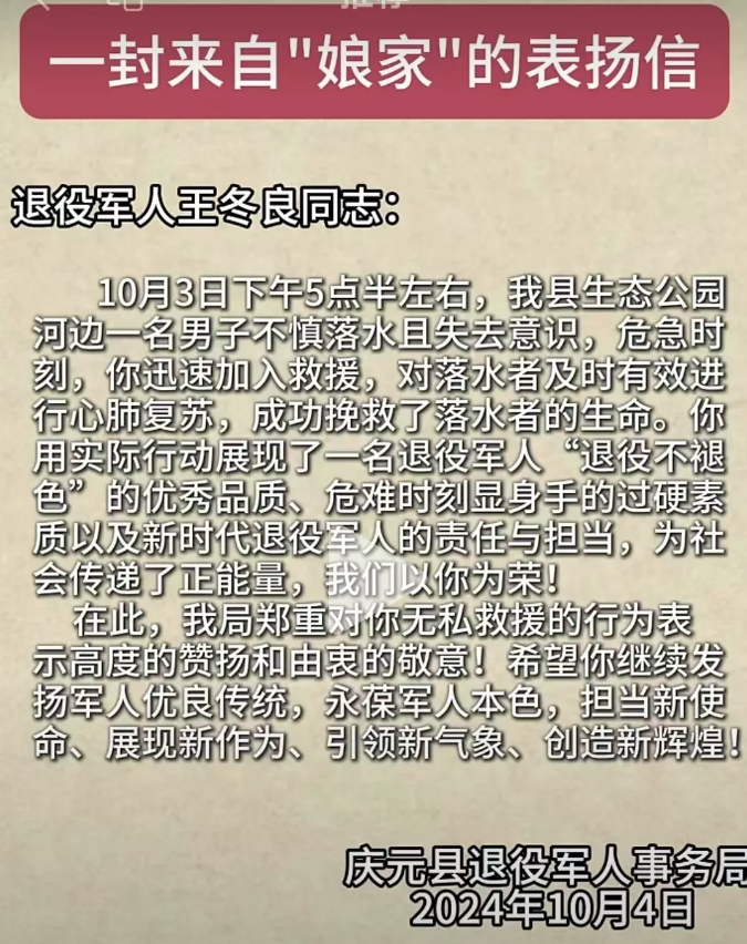近日,收到一封来自“娘家”的表扬信——庆元县退伍军人事务局关于表扬王冬良同志见义勇为事迹的感谢信。10月3日下午5点半左右,丽水庆元县生态公园河边一阵嘈杂声,吸引了回家途中浙江温州星辉游戏有限公司一大党支部书记、大队长王冬良同志,王冬良顺着人们口中的描述飞速赶到现场,正发现一名热心市民迎着湍急的水流搂住一名落水男子奋力游向岸边。在这危急关头,王冬良与另一名身着黑衣的市民与救人者无缝衔接,配合救人者将落水者拉到礁石上立马开展心肺复苏,当时落水者脸色苍白已经没有了意识,经过两个人及时实施心肺复苏,落水男子慢慢恢复了意识,没有了生命危险。