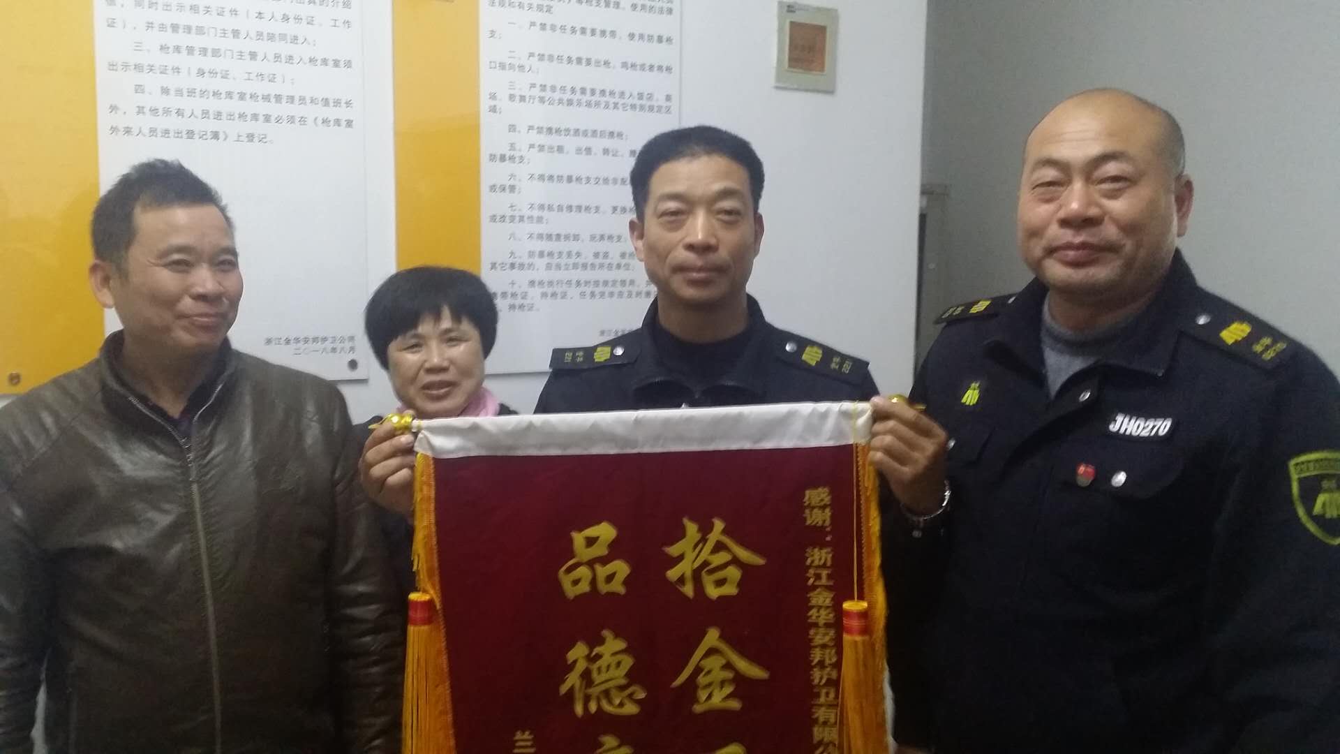 12月10日上午,兰溪市民徐女士将一面印有“拾金不昧 品德高尚”的锦旗送到金华星辉公司江南大队兰溪农商行中队车长洪国奶手中,感谢他拾金不昧,物归原主。经核实,12月7日,该中队车长洪国奶上班途中捡到皮包一只,内有手机及现金票据等。他主动向中队汇报,并及时联系失主,最终物归原主。充分体现了星辉队员文明高尚的品德作风,也展示出了星辉公司的良好形象。