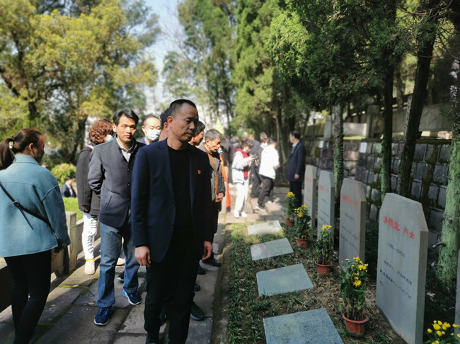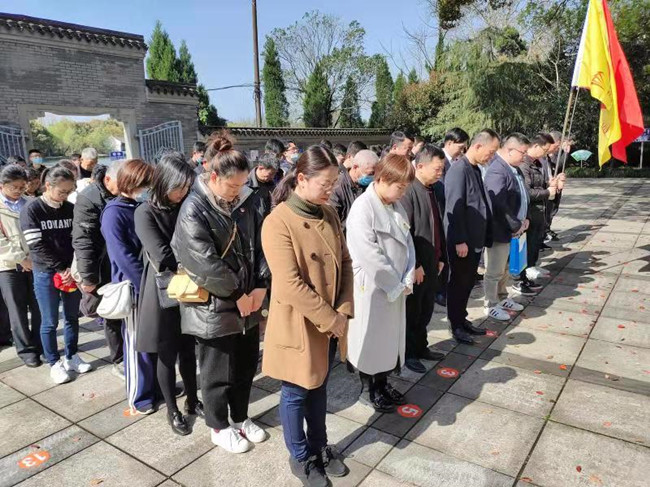 上午10时,激昂雄壮的《义勇军进行曲》响起,全场静默肃立。党员们依次向革命先烈默哀三分钟、鞠躬、为烈士纪念碑敬献花篮、为烈士墓擦拭墓碑并敬献鲜花。最后,全体党员直面英烈墓碑再次重温入党誓词,眼神异常坚定。