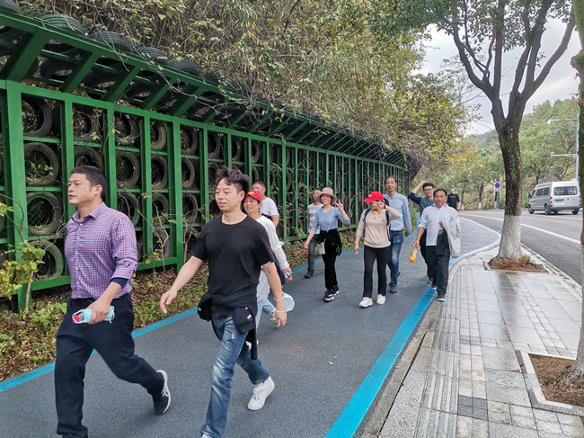 稍作休息后,大家开始徒步环湖,一路上,走过了小普陀,经过了韩玲老街,最终到达东钱湖水上乐园,行程共计10余公里。大家都精神抖擞,兴致高昂,一边呼吸着新鲜空气,一边进行着工作和生活上的交流,欢声笑语中享受大自然带来的喜悦。10公里的徒步,对于大多数人来说,有点漫长,但是全程没有一人掉队,全部坚持走完。蓝天白云、红旗飘飘,星辉志愿者们在东钱湖畔走出了一道亮丽的风景线。