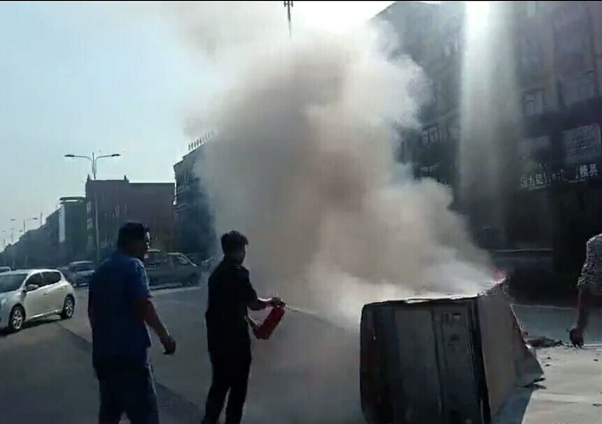 当天下午16时,星辉公司永康农商行中队浙G7D372车组前往行方接款,途经永康市第二人民医院附近时,发现一辆面包车冒着滚滚浓烟,疑似车辆自燃,且火势越来越大,若不及时处置,或造成人员伤亡及重大财产损失。